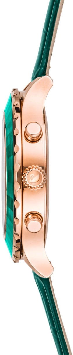 Женские часы Swarovski Octea Lux Chrono 5452498 – это роскошные часы с секундомеромСекундомерСекундоме́р — прибор, способный измерять интервалы времени с точностью до долей секунды. и хронографомХронографФункция позволяет измерять отрезки времени с особой точностью: часы, минуты, секунды. Верным признаком хронографа является наличие на циферблате 3 дополнительных окошек-счётчиков., поистине, образец точности и роскоши, ведь они сочетают в себе лучшие традиции швейцарского часового искусства и неповторимое мастерство Swarovski. Прекрасный аксессуар, подходящий к любому повседневному образу. Часы имеют функцию хронографаХронографФункция позволяет измерять отрезки времени с особой точностью: часы, минуты, секунды. Верным признаком хронографа является наличие на циферблате 3 дополнительных окошек-счётчиков., позволяющую запустить отсчет, остановить его и обнулить результаты. Корпус из нержавеющей стали с PVDPVDУльтратонкое покрытие наносится в технике вакуумного напыления, сочетает в себе нитрид титана особой прочности со слоем золота или оксида хрома. Несёт в себе декоративную или защитную функцию. покрытием оттенка розового золота гармонично сочетается с огранённым кристальным безелемБезельВнешний ободок, закрепляющий стекло. В спортивных часах так называется поворотное кольцо с делениями на циферблате, выполняет роль таймера – замеряет отрезки времени на шкале. Неподвижный безель – элемент декора. Однонаправленно вращающийся безель на дайверских часах позволяет фиксировать моменты погружения и выныривания на поверхность., который встречается только в коллекции часов Swarovski, циферблатом зеленого цвета с рисунком в виде солнечных лучей и ремешком из натуральной кожи с тиснением под крокодила сияют изумрудными оттенками зелёного. Надежное минеральное стеклоМинеральное стеклоМинеральное стекло представляет собой искусственно выращенный минерал кварца. Такое стекло отличается особой устойчивостью к повреждениям и царапинам. Уступает по некоторым качествам сапфировому стеклу. защищает часы от царапин и долго сохраняет первоначальный внешний вид. На часовую, минутную стрелки нанесено люминесцентное покрытиеЛюминесцентное покрытиеПозволяет считывать показания времени в темноте. Производители наносят на стрелки, часовые индексы, безель или поверхность циферблата светонакопительный состав, дающий холодное свечение., которое светится в темноте, создавая необычное изображение.