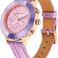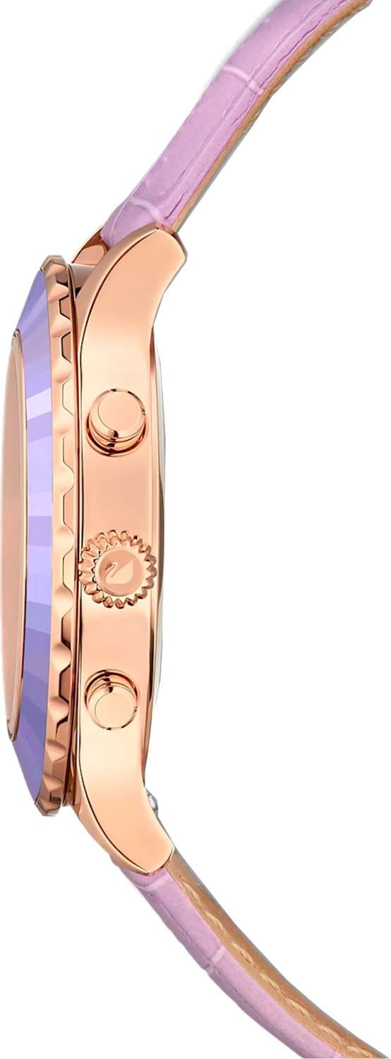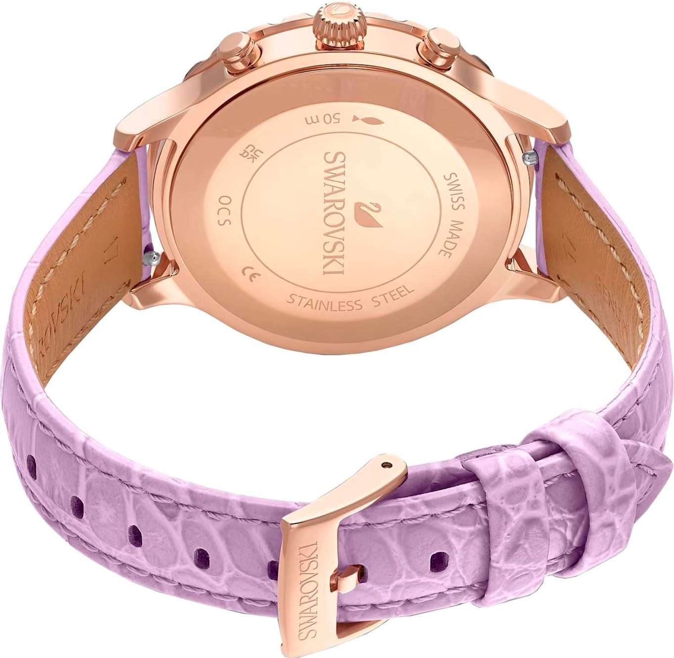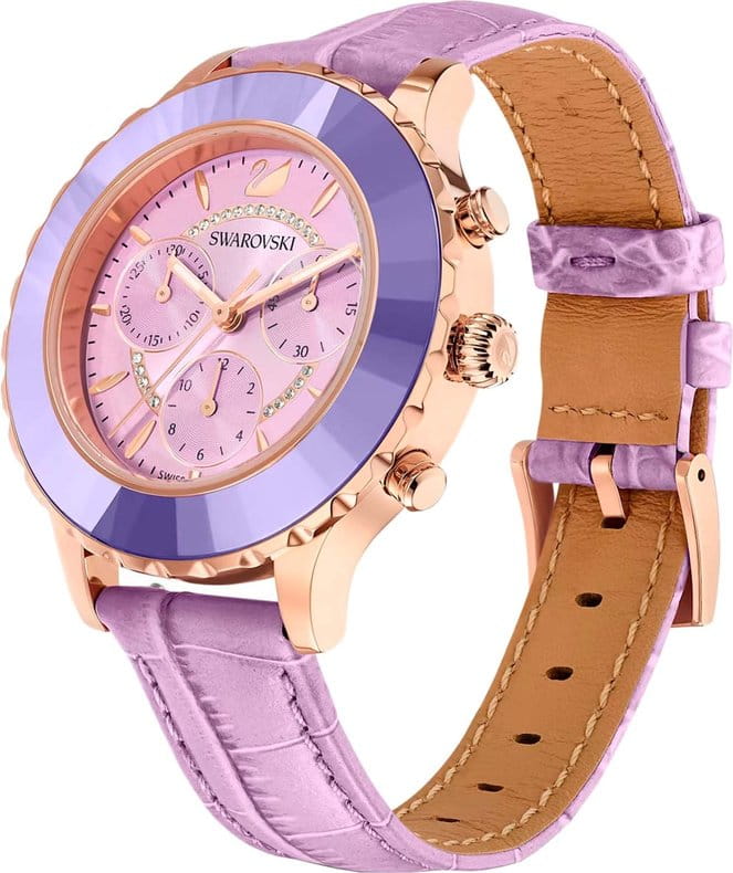 Часы Swarovski 5632263 – это роскошные женские часы с секундомеромСекундомерСекундоме́р — прибор, способный измерять интервалы времени с точностью до долей секунды. и хронографомХронографФункция позволяет измерять отрезки времени с особой точностью: часы, минуты, секунды. Верным признаком хронографа является наличие на циферблате 3 дополнительных окошек-счётчиков., поистине, образец точности и роскоши, ведь они сочетают в себе лучшие традиции швейцарского часового искусства и неповторимое мастерство Swarovski. Прекрасный аксессуар, подходящий к любому повседневному образу. Часы имеют функцию хронографаХронографФункция позволяет измерять отрезки времени с особой точностью: часы, минуты, секунды. Верным признаком хронографа является наличие на циферблате 3 дополнительных окошек-счётчиков., позволяющую запустить отсчет, остановить его и обнулить результаты. Корпус из нержавеющей стали с PVDPVDУльтратонкое покрытие наносится в технике вакуумного напыления, сочетает в себе нитрид титана особой прочности со слоем золота или оксида хрома. Несёт в себе декоративную или защитную функцию. покрытием оттенка розового золота гармонично сочетается с огранённым кристальным безелемБезельВнешний ободок, закрепляющий стекло. В спортивных часах так называется поворотное кольцо с делениями на циферблате, выполняет роль таймера – замеряет отрезки времени на шкале. Неподвижный безель – элемент декора. Однонаправленно вращающийся безель на дайверских часах позволяет фиксировать моменты погружения и выныривания на поверхность., который встречается только в коллекции часов Swarovski. Его фиолетовое сияние удачно сочетается с фиолетовым циферблатом с рисунком в виде солнечных лучей и ремешком из натуральной кожи с тиснением под крокодила. Надежное минеральное стеклоМинеральное стеклоМинеральное стекло представляет собой искусственно выращенный минерал кварца. Такое стекло отличается особой устойчивостью к повреждениям и царапинам. Уступает по некоторым качествам сапфировому стеклу. защищает часы от царапин и долго сохраняет первоначальный внешний вид. На часовую, минутную стрелки нанесено люминесцентное покрытиеЛюминесцентное покрытиеПозволяет считывать показания времени в темноте. Производители наносят на стрелки, часовые индексы, безель или поверхность циферблата светонакопительный состав, дающий холодное свечение., которое светится в темноте, создавая необычное изображение. Эти часы станут не просто аксессуаром, а настоящим украшением, подчеркивающим индивидуальность и утонченность своей владелицы.