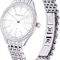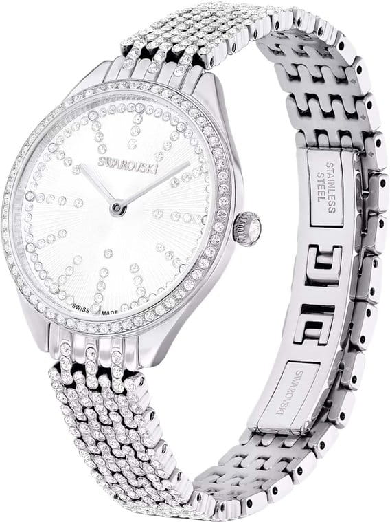 Часы Swarovski 5644062– это воплощение изысканного дизайна и функциональности, созданное для тех, кто ценит красоту и точность. Серебристый круглый корпус из нержавеющей стали оснащен безелемБезельВнешний ободок, закрепляющий стекло. В спортивных часах так называется поворотное кольцо с делениями на циферблате, выполняет роль таймера – замеряет отрезки времени на шкале. Неподвижный безель – элемент декора. Однонаправленно вращающийся безель на дайверских часах позволяет фиксировать моменты погружения и выныривания на поверхность., украшенным паве из тридцати мерцающих кристаллов. Под минеральным стекломМинеральное стеклоМинеральное стекло представляет собой искусственно выращенный минерал кварца. Такое стекло отличается особой устойчивостью к повреждениям и царапинам. Уступает по некоторым качествам сапфировому стеклу. открывается серебристый циферблат украшен гильошированным узором и кристаллами для индексных меток. Рифленая заводная головка украшена кристаллом круглой огранки. Стальной браслет с застежкой «бабочка»Застёжка "бабочка"Такой вид застёжки дополняется предохранителями, помогающими избежать случайного раскрытия браслета. Обладают изящным исполнением. , декорирован кристаллами Swarovski. Водозащита 50WR делает их устойчивыми к влаге, позволяя наслаждаться стильным аксессуаром в любых условиях.