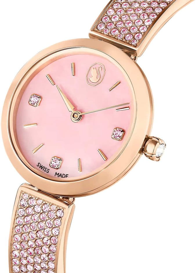 Часы Swarovski 5678756 – это воплощение изысканного дизайна и функциональности, созданное для тех, кто ценит красоту и точность. Произведенные в Швейцарии, эти кварцевые часы представлены в элегантном корпусе с безелемБезельВнешний ободок, закрепляющий стекло. В спортивных часах так называется поворотное кольцо с делениями на циферблате, выполняет роль таймера – замеряет отрезки времени на шкале. Неподвижный безель – элемент декора. Однонаправленно вращающийся безель на дайверских часах позволяет фиксировать моменты погружения и выныривания на поверхность. из нержавеющей стали с розовым PVDPVDУльтратонкое покрытие наносится в технике вакуумного напыления, сочетает в себе нитрид титана особой прочности со слоем золота или оксида хрома. Несёт в себе декоративную или защитную функцию. покрытием. Под минеральным стекломМинеральное стеклоМинеральное стекло представляет собой искусственно выращенный минерал кварца. Такое стекло отличается особой устойчивостью к повреждениям и царапинам. Уступает по некоторым качествам сапфировому стеклу. открывается перламутровый розовый циферблат, дополненный логотипом Swarovski в виде лебедя на 12 часах и кристаллами на отметках 3, 6 и 9 часов. Отсутствие секундной стрелки подчеркивает минимализм и утонченность дизайна. Заводная головка украшена кристаллом круглой огранки, добавляющим блеска и завершенности образу. Стальной браслет с розовым PVDPVDУльтратонкое покрытие наносится в технике вакуумного напыления, сочетает в себе нитрид титана особой прочности со слоем золота или оксида хрома. Несёт в себе декоративную или защитную функцию. покрытием декорирован прозрачными кристаллами Swarovski, создающими неповторимый мерцающий эффект, а ювелирная застежка обеспечивает надежность и комфорт. Водозащита 50WR делает их устойчивыми к влаге, позволяя наслаждаться стильным аксессуаром в любых условиях.
