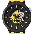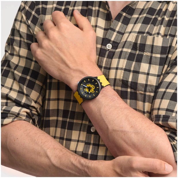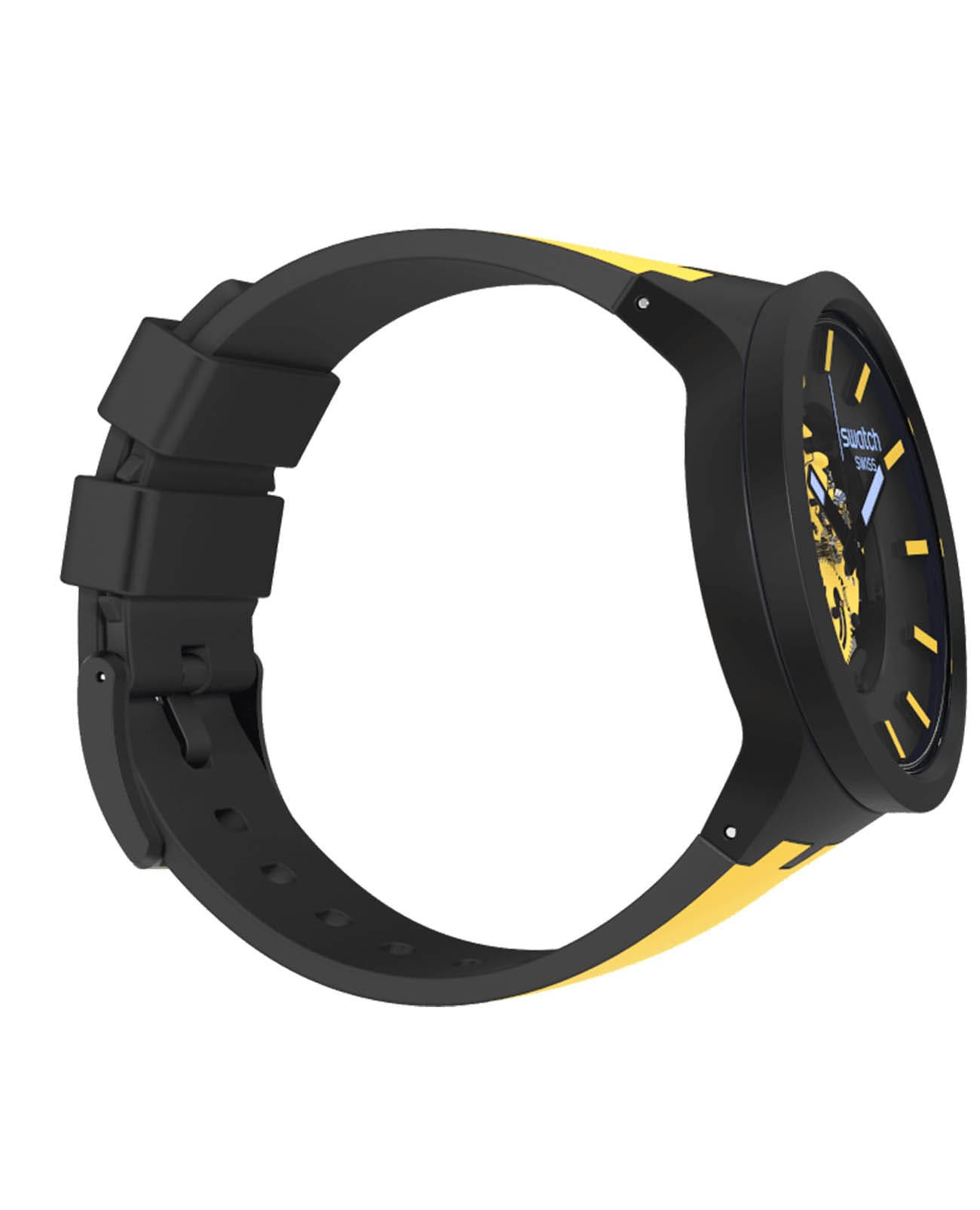 Часы Swatch SB03B109 — это стильный и современный аксессуар для тех, кто ценит лёгкость и комфорт. Часы идеально подойдут как для мужчин, так и для женщин. Центральный элемент этой модели часов — большой корпус со стеклом из био-материала, украшенный 3D-циферблатом с принтами на индексах. Корпус из биокерамикиБиокерамикаБиокерамика — это материал, который на две трети состоит из керамики, на одну треть — из биопластика. Он сочетает в себе лучшие качества обоих материалов и обладает прочностью и шелковистой на ощупь текстурой., а также силиконовые тренчики подчеркивают желтый принт на силиконовом ремешке этих огромных часов. На часовую, минутную стрелки нанесено люминесцентное покрытиеЛюминесцентное покрытиеПозволяет считывать показания времени в темноте. Производители наносят на стрелки, часовые индексы, безель или поверхность циферблата светонакопительный состав, дающий холодное свечение., которое светится в темноте, создавая необычное изображение. Водозащита 30 метров делает часы практичными для повседневного использования. Эти часы подойдут для повседневного ношения и станут ярким акцентом в вашем наряде.