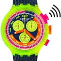Часы Swatch SB06J101-5300 — это стильный и современный аксессуар для тех, кто ценит лёгкость и комфорт. Часы идеально подойдут как для мужчин, так и для женщин. Эти объемные ретро-часы созданы по мотивам часов Swatch Chrono 90-х годов: коллекционные GRAND PRIX SCJ101. Часы с характерным дизайном и яркой кнопкой хронографаХронографФункция позволяет измерять отрезки времени с особой точностью: часы, минуты, секунды. Верным признаком хронографа является наличие на циферблате 3 дополнительных окошек-счётчиков. на двух часах – это идеальные часы, чтобы достичь неожиданных побед. На их необычайно красочном неоновом циферблате с ярко-желтым корпусом шкала тахиметраТахиметрРазмеченная шкала, располагается на ободке или безеле часов. Тахиметр позволяет рассчитать скорость на определённом участке пути, расстояние измеряется в километрах или милях.. На часовую, минутную стрелки оранжевого цвета нанесено люминесцентное покрытиеЛюминесцентное покрытиеПозволяет считывать показания времени в темноте. Производители наносят на стрелки, часовые индексы, безель или поверхность циферблата светонакопительный состав, дающий холодное свечение., которое светится в темноте, создавая необычное изображение. Модель дополнена темно-синим ремешком из биоматериала. Эти часы имеют NFC модуль, поэтому это несомненно лучший способ оплачивать покупки. Водозащита 30 метров делает часы практичными для повседневного использования. Эти часы подойдут для повседневного ношения и станут ярким акцентом в вашем наряде.