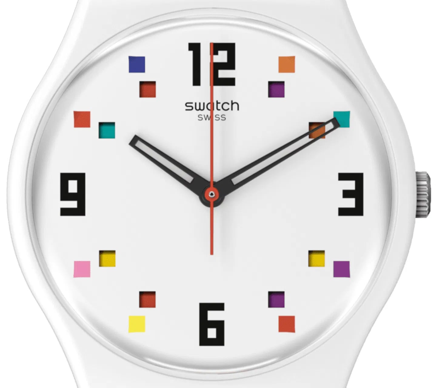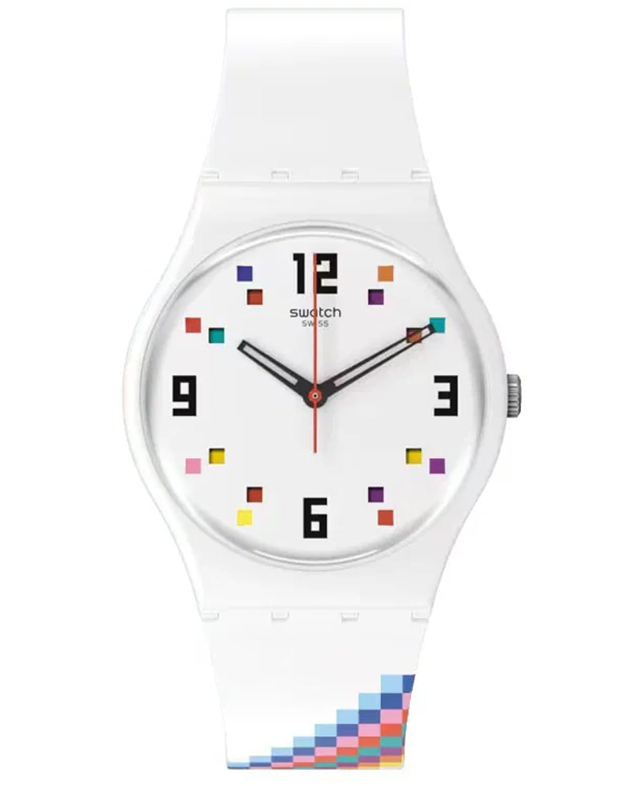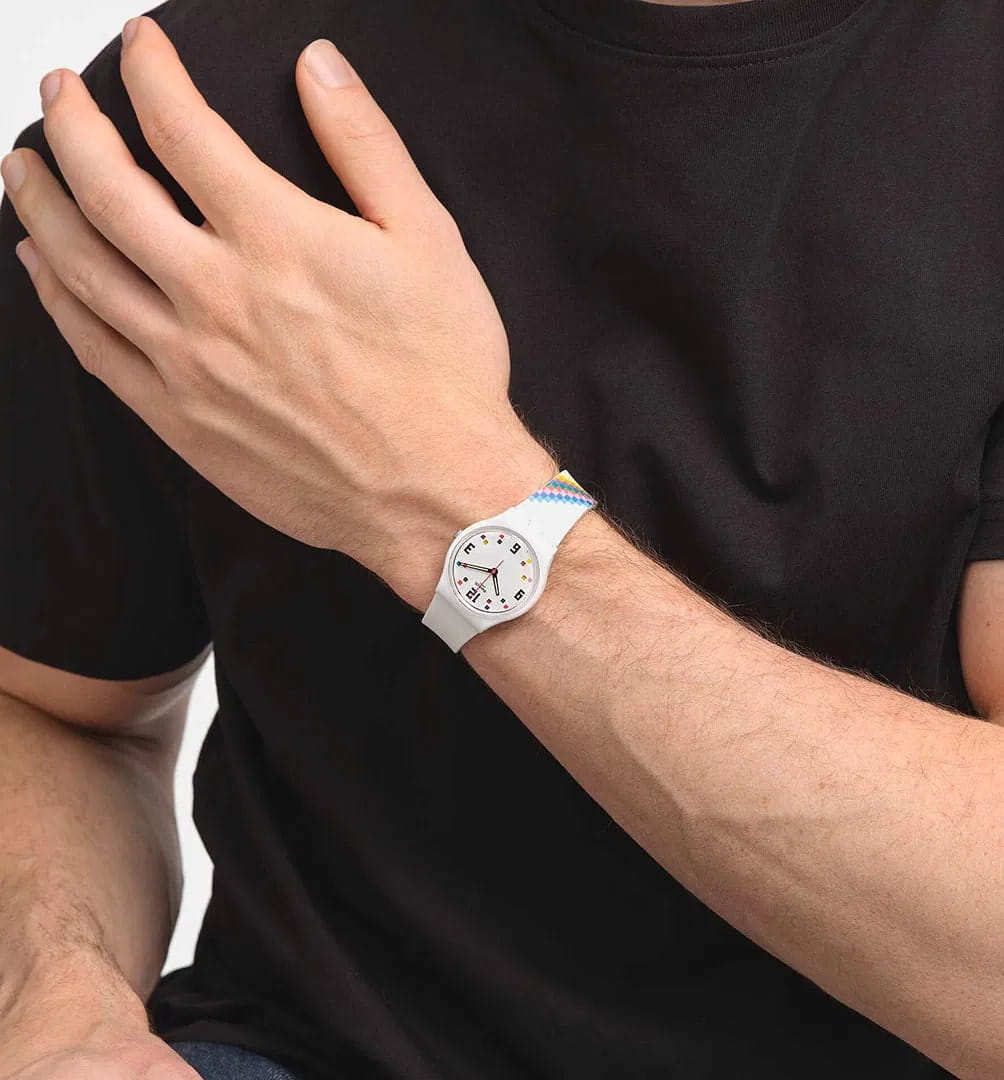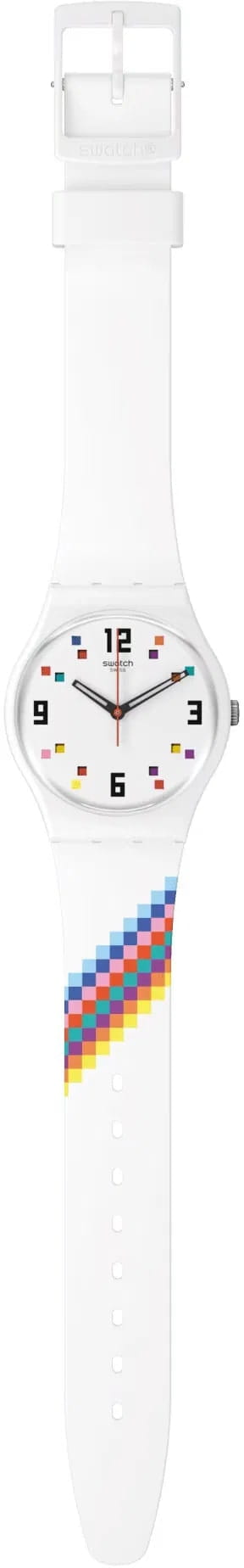 Часы Swatch  SO28W700 — это стильный и современный аксессуар, который идеально подходит для повседневного ношения. Эти часы имеют прочный матовый белый ремешок с принтом и корпус из биоматериала с белым и многоцветным циферблатом. Специальный механизм календарного колеса позволяет пиксельному дизайну на циферблате менять цвета один раз в день. Черные скелетные стрелки указывают время. Ремешок часов белого цвета с пиксельным рисунком выполнен из силикона и имеет регулируемую длину, на классической застежке. Внутри часов установлен надежный кварцевый механизм, который обеспечивает точность хода. Эти часы водонепроницаемы до 30 метров, что позволяет не беспокоиться о случайных брызгах или дождевых каплях. Swatch SO28W700 — это идеальный выбор для тех, кто ценит сочетание стиля, комфорта и функциональности в одном аксессуаре.