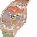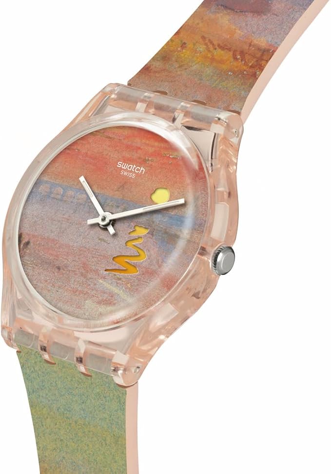 Часы Swatch SO28Z700  —  эффектный и надежный аксессуар. Эти часы из коллекции Swatch x Tate Gallery обладают прозрачным глянцево-розовым корпусом и стеклом из биоматериала. Циферблат и матово-розовый ремешок украшены принтом с репродукцией картины Тёрнера (JMW Turner) «Алый закат» («The Scarlet Sunset»). Время отсчитывают серебристые стрелки с люминесцентным покрытиемЛюминесцентное покрытиеПозволяет считывать показания времени в темноте. Производители наносят на стрелки, часовые индексы, безель или поверхность циферблата светонакопительный состав, дающий холодное свечение., которые светятся в темноте, а солнце на циферблате меняет цвет в течение дня благодаря разноцветному календарному колесу. На прозрачном матовом ремешке расположен логотип Tate Gallery. Ремешок из силикона на стандартной застёжке. Внутри часов установлен надежный кварцевый механизм, который обеспечивает точность хода. Эти часы водонепроницаемы до 30 метров, что позволяет не беспокоиться о случайных брызгах или дождевых каплях. Swatch SO28Z700  — это идеальный выбор для тех, кто ценит сочетание стиля, комфорта и функциональности в одном аксессуаре.
