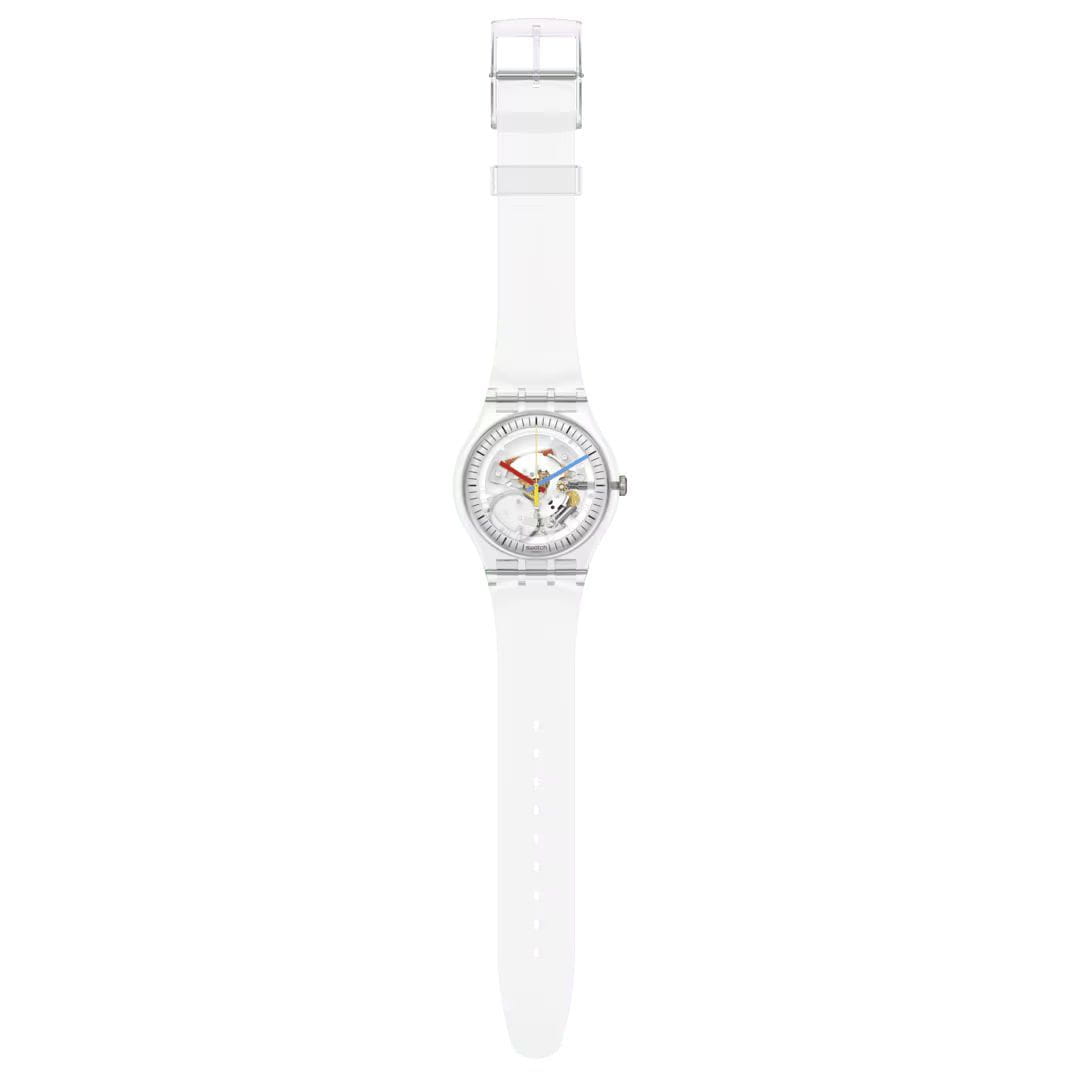 Часы Swatch SO29K100 —  стильный и надежный аксессуар. Современный взгляд на классику. Эти полностью прозрачные часы имеют корпус из биоматериала, циферблат с серебристым кольцом, черными индексами и цветными стрелками, и видимые элементы механизма. Ремешок из пластика TPU на стандартной застёжке. Внутри часов установлен надежный кварцевый механизм, который обеспечивает точность хода. Эти часы водонепроницаемы до 30 метров, что позволяет не беспокоиться о случайных брызгах или дождевых каплях. Swatch SO29K100 — это идеальный выбор для тех, кто ценит сочетание стиля, комфорта и функциональности в одном аксессуаре.