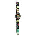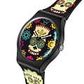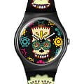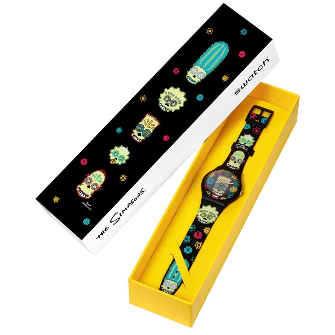 Часы Swatch SO29Z135 — эффектный и надежный аксессуар. Эти праздничные часы входят в коллекцию "Симпсоны" и изображают всю семью Симпсонов в масках на Хэллоуин. Изображения выполнены в многоцветной печати на матовом черном циферблате и ремешке. Черный циферблат украшен принтом и светящимися в темноте деталями, а также черными стрелками часов и минут с люминесцентным покрытиемЛюминесцентное покрытиеПозволяет считывать показания времени в темноте. Производители наносят на стрелки, часовые индексы, безель или поверхность циферблата светонакопительный состав, дающий холодное свечение. и белым принтом в форме костей. Логотип "Симпсоны" выполнен белым цветом на черной петле, а матовая черная пряжка завершает дизайн этих часов. Ремешок из силикона на стандартной застёжке. Внутри часов установлен надежный кварцевый механизм, который обеспечивает точность хода. Эти часы водонепроницаемы до 30 метров, что позволяет не беспокоиться о случайных брызгах или дождевых каплях. Swatch SO29Z135 — это идеальный выбор для тех, кто ценит сочетание стиля, комфорта и функциональности в одном аксессуаре.