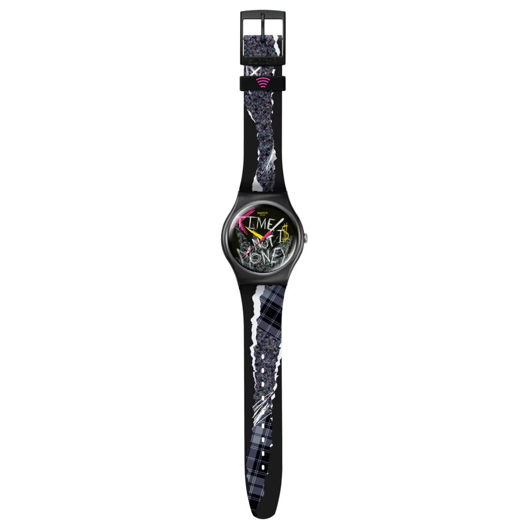 Женские наручные часы Swatch BLANK CHECK SO32B122-5300 — это стильный и современный аксессуар для тех, кто ценит лёгкость и комфорт. На черном циферблате этих часов размещен броский цветной принт с надписью: «Time is not money» («Время - не деньги»). Корпус выполнен из биокерамики,  диаметром 41 мм и толщиной 9.85 мм, что обеспечивает долговечность и утончённый внешний вид. Циферблат защищён органическим стеклом, устойчивым к повреждениям. Модель оснащена кварцевым механизмом, обеспечивающим высокую точность хода. Желтая часовая стрелка в виде молнии, белая минутная и розовая секундная с люминесцентным покрытиемЛюминесцентное покрытиеПозволяет считывать показания времени в темноте. Производители наносят на стрелки, часовые индексы, безель или поверхность циферблата светонакопительный состав, дающий холодное свечение.. Силиконовый ремешок на стандартной застёжке гармонично дополняет корпус и обеспечивает комфортное ношение. Водозащита 30 метров позволит защитить корпус от случайных брызг или капель дождя. Эти часы подойдут для повседневного ношения и станут ярким акцентом в вашем наряде. Эти часы оснащены функцией SwatchPAY!.
