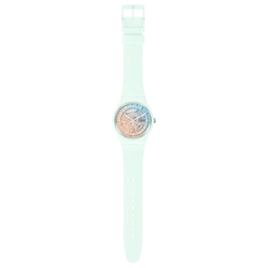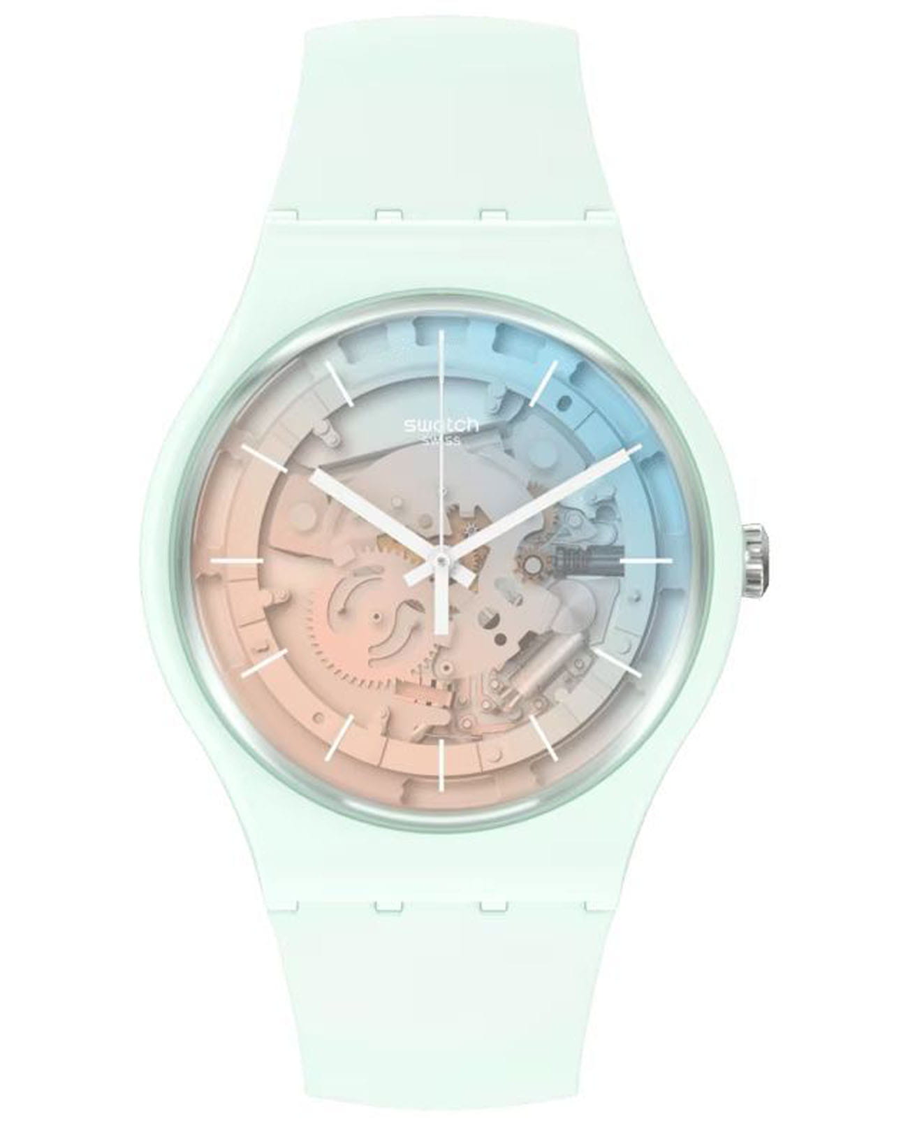 Часы Swatch SO32S101 — это стильный и универсальный аксессуар, подходящий как для мужчин, так и для женщин. Модель отличается круглым корпусом диаметром 41 мм и толщиной 9 мм, выполненным из прочного пластика светло-голубого цвета. Циферблат также покрыт стеклом голубо-розового оттенка, что создает гармоничный и привлекательный внешний вид. Часы оснащены кварцевым механизмом, обеспечивающим точное измерение времени. Стекло из плексигласа защищает циферблат от царапин и повреждений. Ремешок выполнен из силикона, что обеспечивает комфорт при носке. Водонепроницаемость 3 бар позволяет не беспокоиться о случайных брызгах или кратковременном погружении в воду. Модель SO32S101 не имеет функции отображения даты, что придает циферблату минималистичный и чистый вид. Прозрачный циферблат позволяет наблюдать механизм часов. Эти часы станут ярким акцентом в любом образе. Они идеально подойдут как для повседневной носки, так и для особых случаев, привлекая внимание своим необычным цветовым решением и современным дизайном.