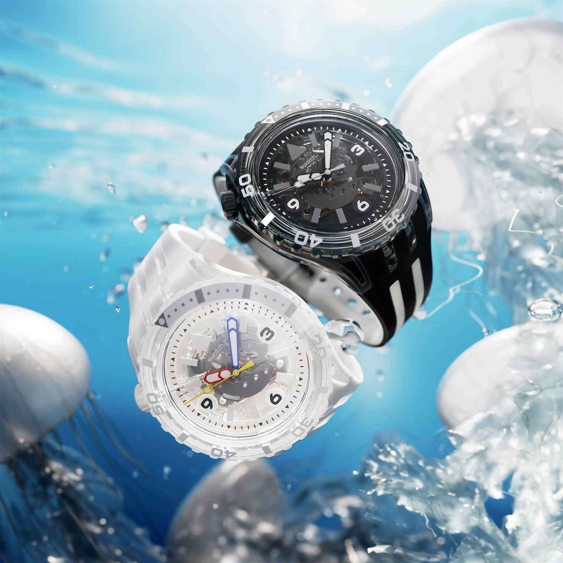 Мужские дайверские часы Swatch AURELIA AURITA SSCU09K100 — это стильный и современный аксессуар для тех, кто ценит лёгкость и комфорт. Корпус выполнен из биокерамики, который состоит из матовых и блестящих прозрачных частей из биоматериала, диаметром 44 мм и толщиной 15.4 мм, что обеспечивает долговечность и утончённый внешний вид. Циферблат защищён органическим стеклом, устойчивым к повреждениям. Модель оснащена кварцевым механизмом, обеспечивающим высокую точность хода. БезельБезельВнешний ободок, закрепляющий стекло. В спортивных часах так называется поворотное кольцо с делениями на циферблате, выполняет роль таймера – замеряет отрезки времени на шкале. Неподвижный безель – элемент декора. Однонаправленно вращающийся безель на дайверских часах позволяет фиксировать моменты погружения и выныривания на поверхность. из белого просвечивающего биоматериала с серо-белым принтом, светящимся в темноте, и белая матовая заводная головка из биокерамики, размещенная в районе отметки 10 часов. Стрелки и метки с люминесцентным покрытиемЛюминесцентное покрытиеПозволяет считывать показания времени в темноте. Производители наносят на стрелки, часовые индексы, безель или поверхность циферблата светонакопительный состав, дающий холодное свечение.. Силиконовый ремешок на стандартной застёжке гармонично дополняет корпус и обеспечивает комфортное ношение. Водозащита 100 метров позволит плавать, нырять и заниматься другими водными видами спорта. Эти часы подойдут для повседневного ношения и станут ярким акцентом в вашем наряде.