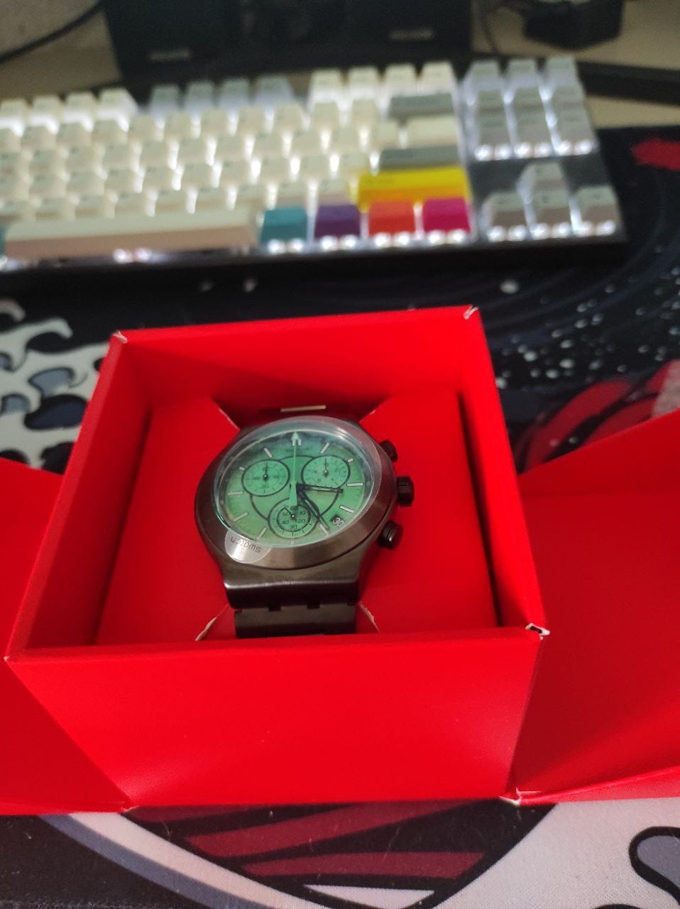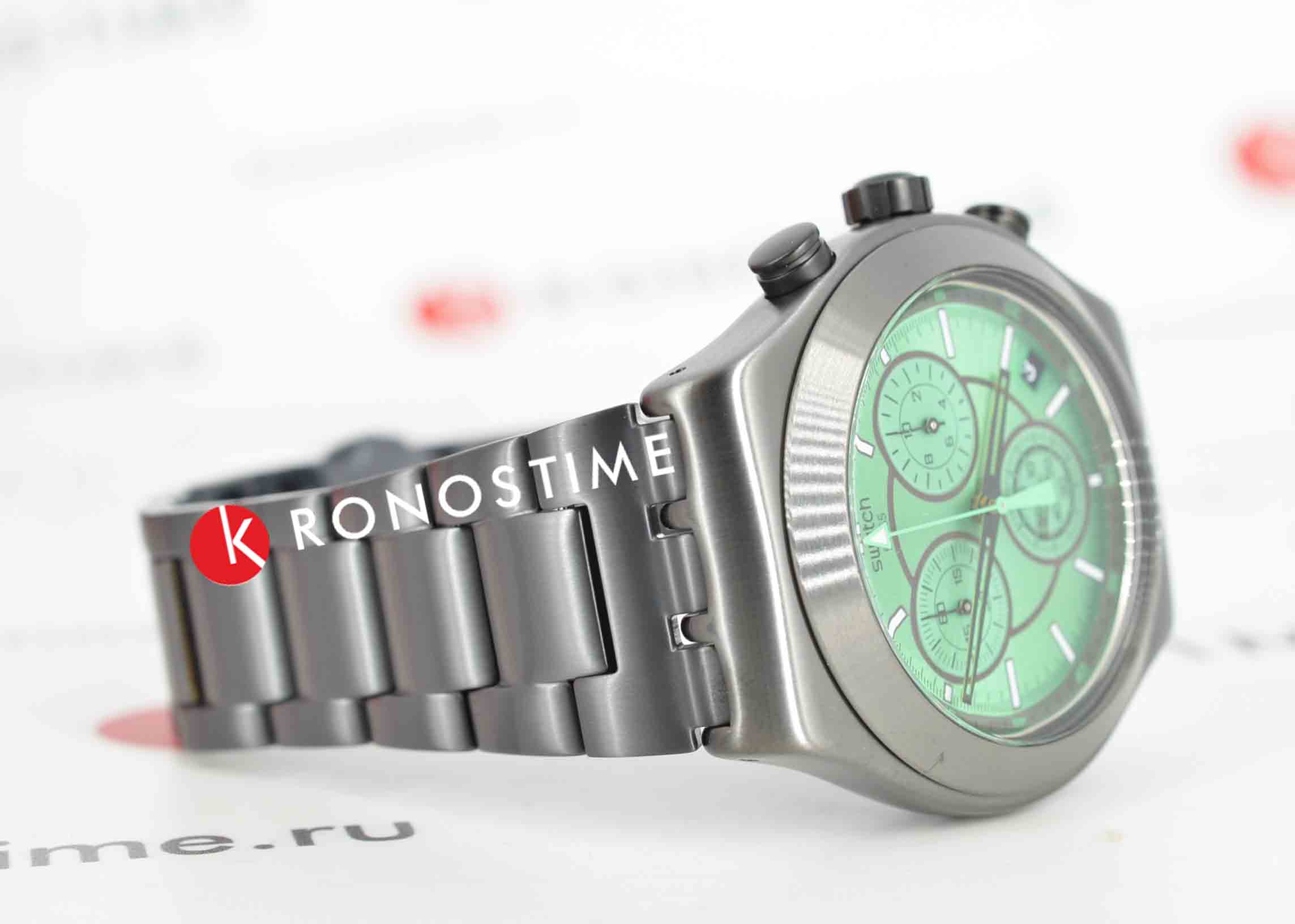 Часы Swatch YVM407G — это стильный и современный аксессуар для тех, кто ценит лёгкость и комфорт. Этот стильный хронографХронографФункция позволяет измерять отрезки времени с особой точностью: часы, минуты, секунды. Верным признаком хронографа является наличие на циферблате 3 дополнительных окошек-счётчиков. оснащен зеленым циферблатом с радиальной полировкой, черными часовой и минутной стрелками-скелетонами. Кончик зеленой секундной стрелки хронографа светится в темноте благодаря люминесцентному покрытиюЛюминесцентное покрытиеПозволяет считывать показания времени в темноте. Производители наносят на стрелки, часовые индексы, безель или поверхность циферблата светонакопительный состав, дающий холодное свечение.. Стрелки мини-циферблатов черные. На внешнее кольцо темно-серой расцветки нанесен черно-зеленый принт с минутной шкалой. Часовые индексы светятся в темноте благодаря люминесцентному покрытиюЛюминесцентное покрытиеПозволяет считывать показания времени в темноте. Производители наносят на стрелки, часовые индексы, безель или поверхность циферблата светонакопительный состав, дающий холодное свечение., а между отметками 4 и 5 часов расположено черное окошко календаря с белым принтом. Матированный корпус, безельБезельВнешний ободок, закрепляющий стекло. В спортивных часах так называется поворотное кольцо с делениями на циферблате, выполняет роль таймера – замеряет отрезки времени на шкале. Неподвижный безель – элемент декора. Однонаправленно вращающийся безель на дайверских часах позволяет фиксировать моменты погружения и выныривания на поверхность., пушеры и браслет с застёжкой «бабочка»Застёжка "бабочка"Такой вид застёжки дополняется предохранителями, помогающими избежать случайного раскрытия браслета. Обладают изящным исполнением. выполнены из нержавеющей стали с черным PVDPVDУльтратонкое покрытие наносится в технике вакуумного напыления, сочетает в себе нитрид титана особой прочности со слоем золота или оксида хрома. Несёт в себе декоративную или защитную функцию. покрытием. Водозащита 30 метров делает часы практичными для повседневного использования. Эти часы подойдут для повседневного ношения и станут ярким акцентом в вашем наряде.