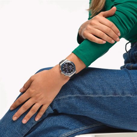 Часы Swatch YVS496 — это стильный и современный аксессуар для тех, кто ценит лёгкость и комфорт. Этот стильный хронографХронографФункция позволяет измерять отрезки времени с особой точностью: часы, минуты, секунды. Верным признаком хронографа является наличие на циферблате 3 дополнительных окошек-счётчиков. обладает элегантным синим циферблатом с окошком даты в положении «4 часа», заключенны в матовый корпус из нержавеющей стали с полированными элементами. БезельБезельВнешний ободок, закрепляющий стекло. В спортивных часах так называется поворотное кольцо с делениями на циферблате, выполняет роль таймера – замеряет отрезки времени на шкале. Неподвижный безель – элемент декора. Однонаправленно вращающийся безель на дайверских часах позволяет фиксировать моменты погружения и выныривания на поверхность. этих часов с PVDPVDУльтратонкое покрытие наносится в технике вакуумного напыления, сочетает в себе нитрид титана особой прочности со слоем золота или оксида хрома. Несёт в себе декоративную или защитную функцию. покрытием, а кожаный ремешок украшен тиснением, имитирующим кожу аллигатора, и контрастной белой строчкой. На часовую, минутную стрелки нанесено люминесцентное покрытиеЛюминесцентное покрытиеПозволяет считывать показания времени в темноте. Производители наносят на стрелки, часовые индексы, безель или поверхность циферблата светонакопительный состав, дающий холодное свечение., которое светится в темноте, создавая необычное изображение. Водозащита 30 метров делает часы практичными для повседневного использования. Эти часы подойдут для повседневного ношения и станут ярким акцентом в вашем наряде.