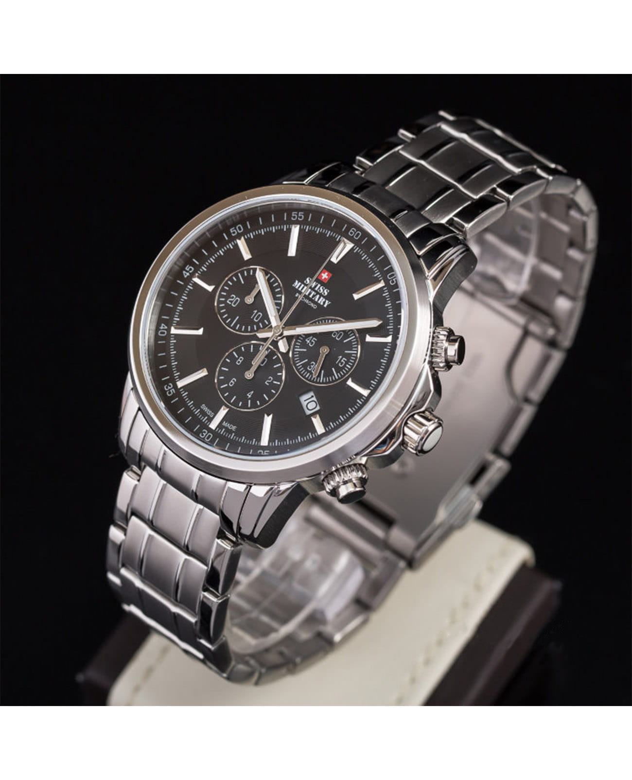 Стильные швейцарские наручные часы-хронографХронографФункция позволяет измерять отрезки времени с особой точностью: часы, минуты, секунды. Верным признаком хронографа является наличие на циферблате 3 дополнительных окошек-счётчиков. Swiss Military by Chrono SM34052.01 как нельзя лучше подойдут ценителям современных техно-решений. Вся корпусная часть, за исключением сапфирового стеклаСапфировое стеклоПрочный и надёжный материал из кристалла сапфира синтетического происхождения, характеризующийся особой твёрдостью и устойчивостью к царапинам и повреждениям., состоит из инновационной нержавейки. Функциональность часов дополняет тахометрическая шкала. Заводная головка с защитой. Браслет с раскладной застёжкойРаскладная застёжкаТакой тип застёжки используется только на браслетах из металла. Она никогда не раскрывается полностью, происходит разделение на 2 и более частей. Раскладывающая застёжка снизит вероятность потери часов к минимуму..