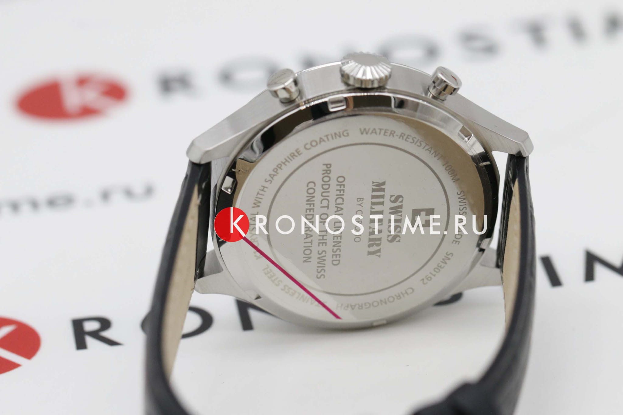 Мужские швейцарские наручные часы-хронографХронографФункция позволяет измерять отрезки времени с особой точностью: часы, минуты, секунды. Верным признаком хронографа является наличие на циферблате 3 дополнительных окошек-счётчиков. Swiss Military by Chrono SM30192.08, кварцевый механизм с высокой точностью. Класс водозащиты: 100 метров, позволит плавать, нырять и заниматься другими водными видами спорта. Корпус часов изготовлен из стали серебристого цвета. Апертура даты в позиции 6 часов. Черный кожаный ремешок с классической пряжкой. Модель оснащена секундомеромСекундомерСекундоме́р — прибор, способный измерять интервалы времени с точностью до долей секунды.. Стрелки и метки с люминесцентной подсветкойЛюминесцентное покрытиеПозволяет считывать показания времени в темноте. Производители наносят на стрелки, часовые индексы, безель или поверхность циферблата светонакопительный состав, дающий холодное свечение..