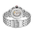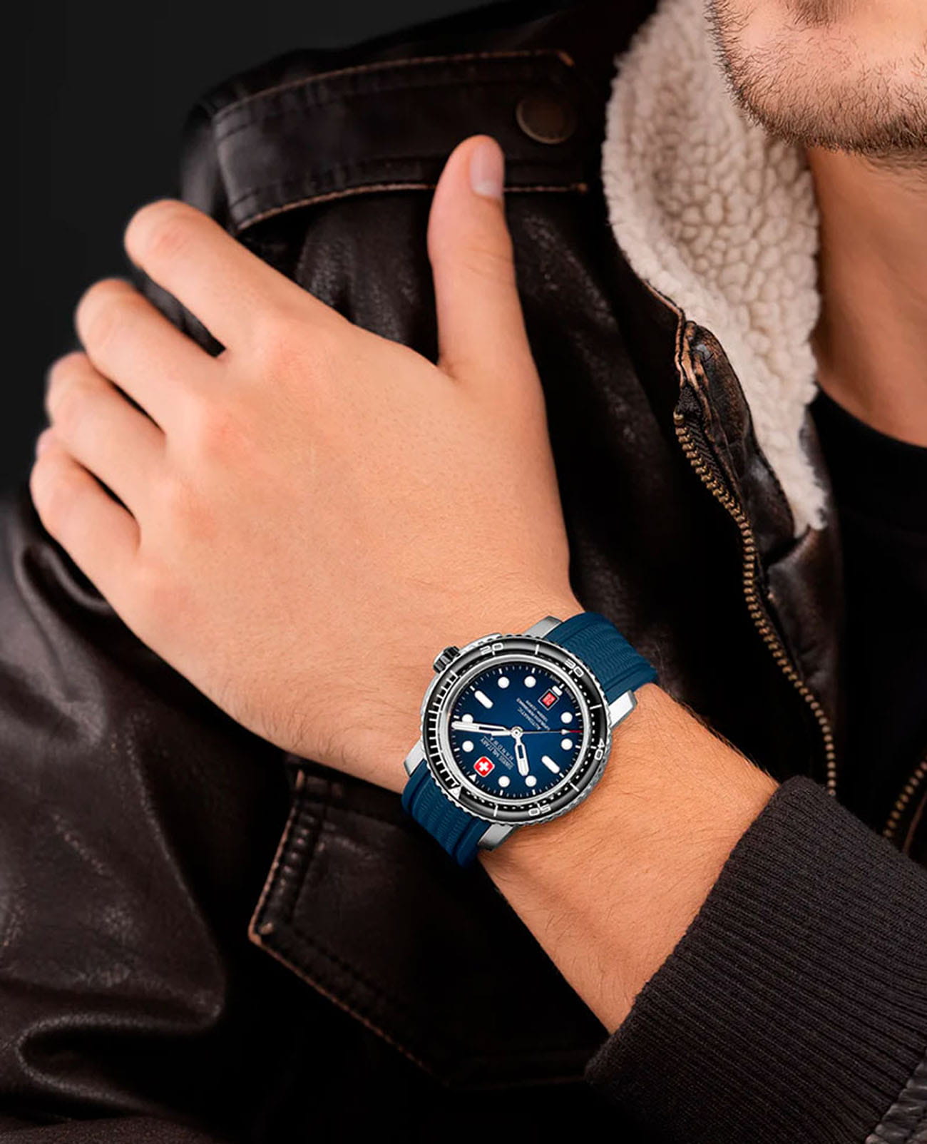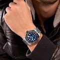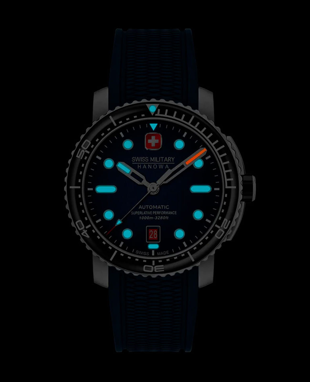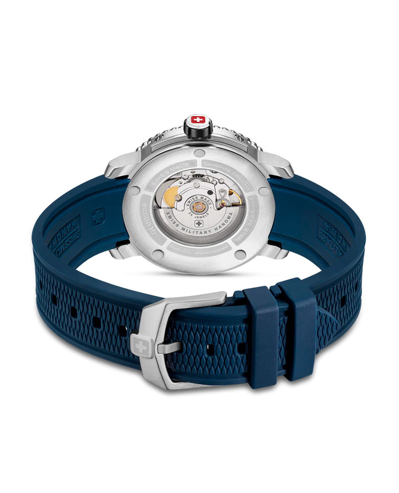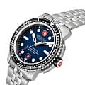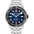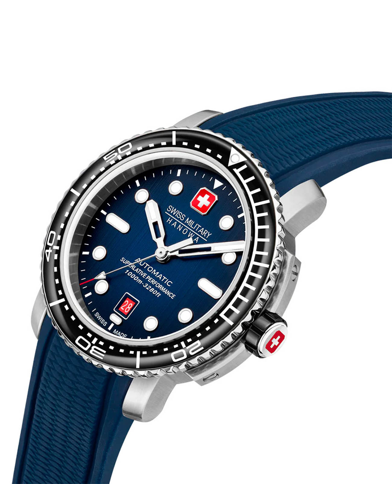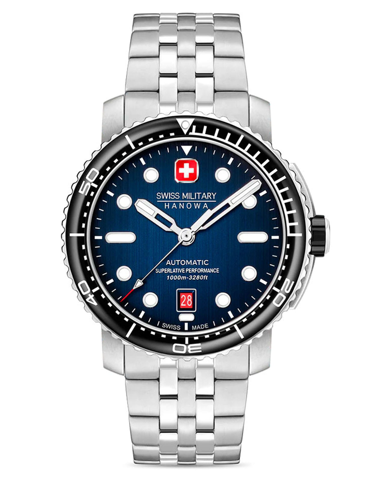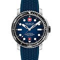 Swiss Military Hanowa Maitre Plongeur Automatic SMWGL0002002 — профессиональные часы для дайвинга с швейцарской точностью и надёжной конструкцией. Корпус диаметром 44 мм выполнен из нержавеющей стали, что обеспечивает прочность и долговечность. Однонаправленный вращающийся безельБезельВнешний ободок, закрепляющий стекло. В спортивных часах так называется поворотное кольцо с делениями на циферблате, выполняет роль таймера – замеряет отрезки времени на шкале. Неподвижный безель – элемент декора. Однонаправленно вращающийся безель на дайверских часах позволяет фиксировать моменты погружения и выныривания на поверхность. с керамической вставкой позволяет точно отслеживать время погружения. Синий циферблат украшен накладными часовыми индексами и стрелками с люминесцентным покрытиемЛюминесцентное покрытиеПозволяет считывать показания времени в темноте. Производители наносят на стрелки, часовые индексы, безель или поверхность циферблата светонакопительный состав, дающий холодное свечение., что гарантирует превосходную читаемость даже в темноте. Окошко даты расположено на отметке «6 часов». Защиту циферблата обеспечивает сапфировое стеклоСапфировое стеклоПрочный и надёжный материал из кристалла сапфира синтетического происхождения, характеризующийся особой твёрдостью и устойчивостью к царапинам и повреждениям., устойчивое к царапинам. Внутри установлен швейцарский автоматический механизм Soprod P024 с запасом хода до 38 часов, обеспечивающий надёжность и точность хода. Часы укомплектованы браслетом из нержавеющей стали, а раскладная застёжкаРаскладная застёжкаТакой тип застёжки используется только на браслетах из металла. Она никогда не раскрывается полностью, происходит разделение на 2 и более частей. Раскладывающая застёжка снизит вероятность потери часов к минимуму. гарантирует комфортную и надёжную фиксацию на запястье. В комплекте также предусмотрен сменный силиконовый ремешок. Водонепроницаемость 1000 метров делает модель идеальным выбором для глубоководного дайвинга. Автоматический гелиевый клапан обеспечивает безопасное выравнивание давления при всплытии.
