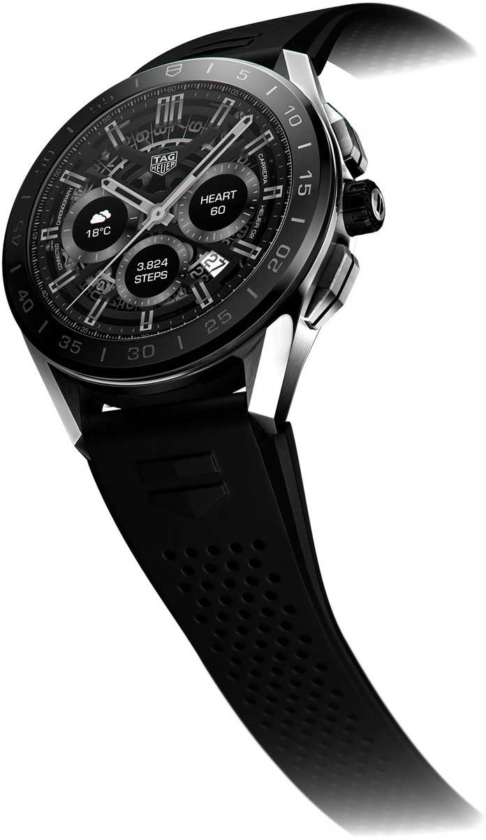 Новое поколение смарт-часов от TAG Heuer - это образец мастерства бренда, воплощающего в себе передовые технологии двадцать первого века. Эти часы – идеальный выбор для ценителей часового искусства и приверженцев активного образа жизни. Connected. Унисекс. Смарт-часы работают на базе четырехъядерного процессора Qualcomm® Snapdragon™ Wear 3100 и оснащены операционной системой Wear OS от Google. Совместимы с ОС Android 6.0+ (исключая версию Go) и iOS 10.0+. Встроенная система бесконтактной оплаты NFC (Google Pay). Микрофон. Голосовой помощник Google Assistant и Google Translate. Возможность установка приложений из Google Play. Возможность управления функциями телефона как через сенсорный дисплей, так и через функциональные кнопки и заводную головку. Подключение к интернету через Wi-Fi или с помощью интернета мобильного телефона. Синхронизация со смартфоном через Bluetooth. Поддержка спортивных онлайн-сообществ. Совместимость с приложением TAG Heuer Sports. Настраиваемые экраны: скелетонизированный циферблат мануфактурного механизма Heuer 02, цифровой механизм Carrera Heuer 01, анимация Orbital на основе уникальной нейросетевой модели, а также дисплей, вдохновленный фирменной спиралью баланса из углеродного композита на основе гексагональных нанотрубок. Настраиваемая подсветка (яркость/режим). Цветной сенсорный дисплей на органических светодиодах (OLED) размером 1,39'' и разрешением 454х454 пикселей (326 ppi). Второй часовой пояс. SPLIT-хронограф. Сервисы навигации GPS, GLONASS, BeiDou и QZSS. Пульсометр, компас, акселерометр, гироскоп, секундомер, таймер и будильник. Мониторинг количества израсходованных калорий. Вибро-оповещение. Перезаряжаемый аккумулятор 430мАч, которого хватает на сутки, включая часовую тренировку. Время полной подзарядки 1,5 часа. Керамический безель. Круглый корпус. Задняя крышка корпуса с винтовым креплением. Каучуковый ремешок с системой быстрой замены. В комплект входят магнитное зарядное устройство аккумулятора и специальный дорожный чехол.