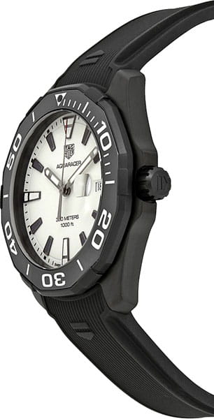 TAG Heuer Aquaracer WAY108A.FT6141 — элегантные мужские часы, сочетающие современный дизайн и высокую функциональность. Корпус диаметром 43 мм выполнен из титана с PVD-покрытиемPVDУльтратонкое покрытие наносится в технике вакуумного напыления, сочетает в себе нитрид титана особой прочности со слоем золота или оксида хрома. Несёт в себе декоративную или защитную функцию. чёрного цвета, обеспечивающим лёгкость и прочность. Белый циферблат с часовыми метками и стрелками, покрытыми люминесцентным покрытиемЛюминесцентное покрытиеПозволяет считывать показания времени в темноте. Производители наносят на стрелки, часовые индексы, безель или поверхность циферблата светонакопительный состав, дающий холодное свечение., гарантирует отличную читаемость в любых условиях освещения. Часы оснащены точным кварцевым механизмом, обеспечивающим стабильное отображение времени. Функциональность включает индикацию часов, минут, секунд и даты, расположенной на отметке «3 часа». Сапфировое стеклоСапфировое стеклоПрочный и надёжный материал из кристалла сапфира синтетического происхождения, характеризующийся особой твёрдостью и устойчивостью к царапинам и повреждениям. обеспечивает надёжную защиту от царапин и превосходную читаемость. Чёрный каучуковый ремешок оснащён раскладной застёжкойРаскладная застёжкаТакой тип застёжки используется только на браслетах из металла. Она никогда не раскрывается полностью, происходит разделение на 2 и более частей. Раскладывающая застёжка снизит вероятность потери часов к минимуму. из титана с PVD-покрытиемPVDУльтратонкое покрытие наносится в технике вакуумного напыления, сочетает в себе нитрид титана особой прочности со слоем золота или оксида хрома. Несёт в себе декоративную или защитную функцию. и двойными предохранительными кнопками. Водозащита до 300 метров (30 бар) делает модель идеальной для дайвинга и активного образа жизни.