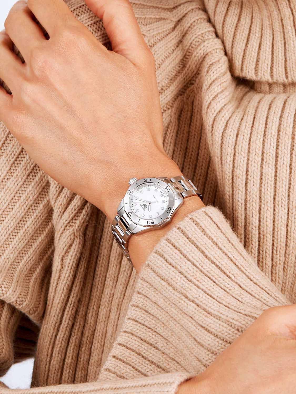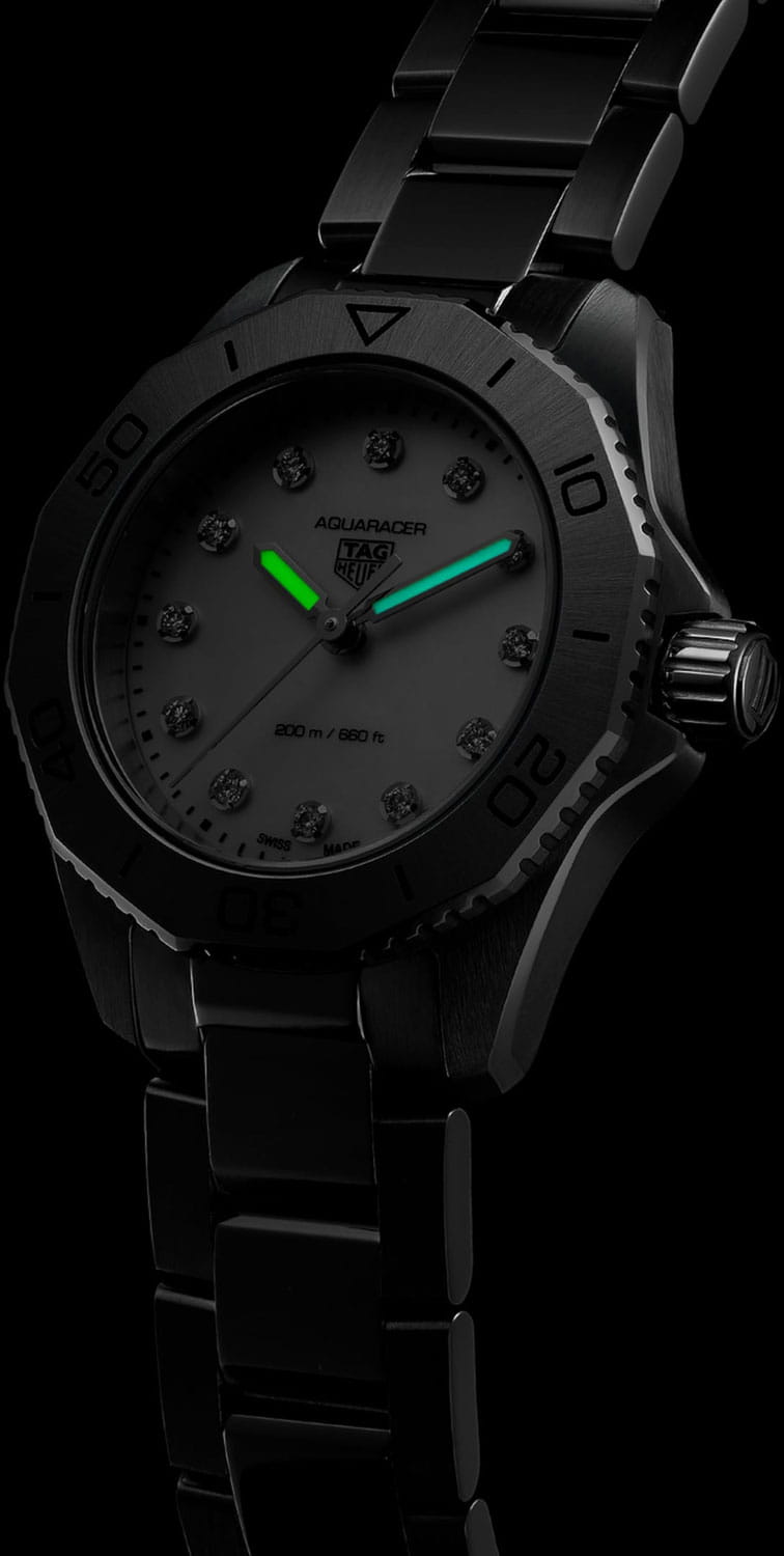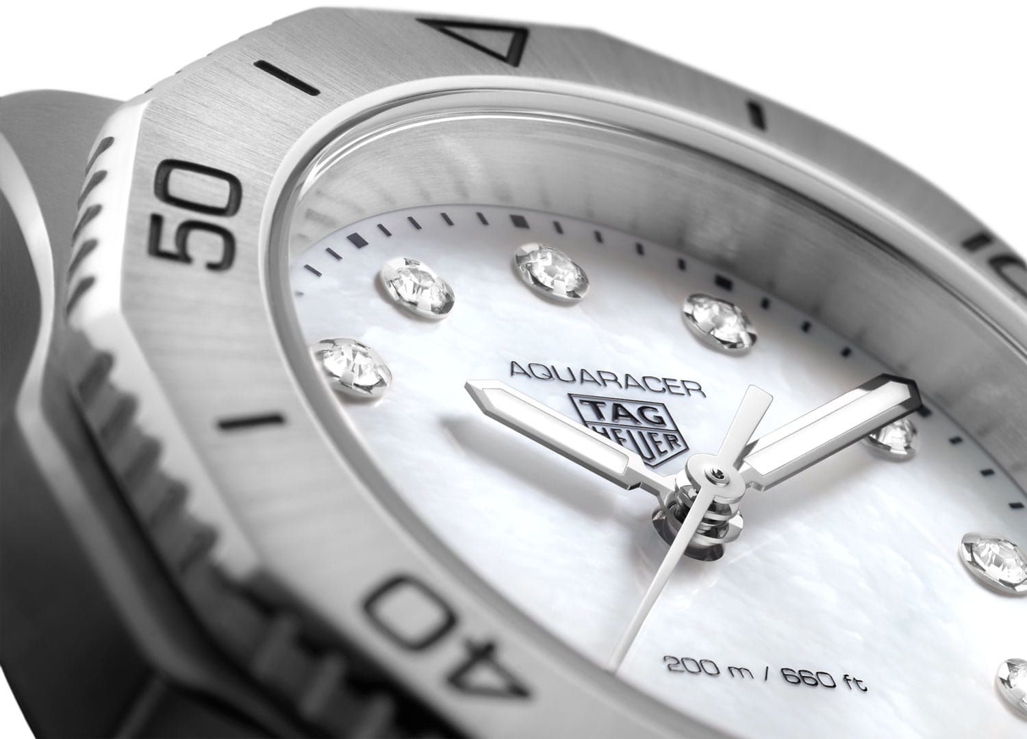 Женские швейцарские часы TAG Heuer Aquaracer Professional 200 WBP1416.BA0622, кварцевый механизм с высокой точностью. Сапфировое стеклоСапфировое стеклоПрочный и надёжный материал из кристалла сапфира синтетического происхождения, характеризующийся особой твёрдостью и устойчивостью к царапинам и повреждениям. устойчивое к появлению царапин, обладающее высокой прозрачностью. Класс водозащиты: 200 метров, позволит плавать, нырять и заниматься другими водными видами спорта. Корпус часов изготовлен из стали. Стальной браслет на раскладной застёжкеРаскладная застёжкаТакой тип застёжки используется только на браслетах из металла. Она никогда не раскрывается полностью, происходит разделение на 2 и более частей. Раскладывающая застёжка снизит вероятность потери часов к минимуму.. Стальной рифленый вращающийся 12-гранный безельБезельВнешний ободок, закрепляющий стекло. В спортивных часах так называется поворотное кольцо с делениями на циферблате, выполняет роль таймера – замеряет отрезки времени на шкале. Неподвижный безель – элемент декора. Однонаправленно вращающийся безель на дайверских часах позволяет фиксировать моменты погружения и выныривания на поверхность. с минутной шкалой выполнен с радиальным сатинированием поверхности. Перламутровый циферблат украшен 12-ю бриллиантами. Метки в виде штрихов. Стрелки и метки с родиевым и люминесцентным покрытиемЛюминесцентное покрытиеПозволяет считывать показания времени в темноте. Производители наносят на стрелки, часовые индексы, безель или поверхность циферблата светонакопительный состав, дающий холодное свечение. Superluminova. Рифленая заводная головка с защитой. Задняя крышка украшена выгравированной 8-лучевой розой ветров на фоне узора сотовой структуры.