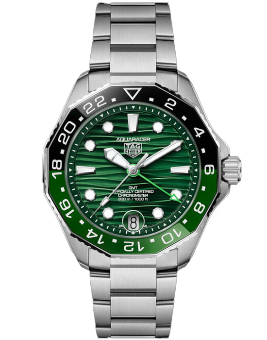 TAG Heuer Aquaracer созданные для погружения и серфинга по всему миру благодаря своей экстремальной технической конструкции и калибру GMT. Благодаря свежему и спортивному стилю он станет отличным аксессуаром. Прочный 42-миллиметровый корпус с водонепроницаемостью 300 м и прочным сине-белым керамическим безелем выдержит любые условия. Благодаря автоматическому калибру 7 GMT, которым оснащены часы TAG Heuer Aquaracer, отслеживание времени по всему миру никогда не было таким простым.Часы оснащены желтой стрелкой GMT, которая делает один полный оборот в день, следуя 24-часовой шкале, видимой на двунаправленном безеле GMT, что позволяет вам определять второй часовой пояс на вашем запястье. Безель представлен в двух цветах, чтобы отличать день от ночи: половина темно-синего цвета, чтобы соответствовать циферблату и представлять ночные часы с 6 вечера до 6 утра; и половина ярко-белого цвета, чтобы обозначить дневные часы с 6 утра до 6 вечера. Механический механизм с автоподзаводом. Сапфировое стеклоСапфировое стеклоПрочный и надёжный материал из кристалла сапфира синтетического происхождения, характеризующийся особой твёрдостью и устойчивостью к царапинам и повреждениям. устойчивое к появлению царапин, обладающее высокой прозрачностью. Стрелки с люминесцентным покрытиемЛюминесцентное покрытиеПозволяет считывать показания времени в темноте. Производители наносят на стрелки, часовые индексы, безель или поверхность циферблата светонакопительный состав, дающий холодное свечение.. Вращающийся безельБезельВнешний ободок, закрепляющий стекло. В спортивных часах так называется поворотное кольцо с делениями на циферблате, выполняет роль таймера – замеряет отрезки времени на шкале. Неподвижный безель – элемент декора. Однонаправленно вращающийся безель на дайверских часах позволяет фиксировать моменты погружения и выныривания на поверхность. из керамики. Класс водозащиты: 300 метров, позволит плавать, нырять и заниматься другими водными видами спорта. Корпус часов изготовлен из стали. Браслет с раскладной застёжкойРаскладная застёжкаТакой тип застёжки используется только на браслетах из металла. Она никогда не раскрывается полностью, происходит разделение на 2 и более частей. Раскладывающая застёжка снизит вероятность потери часов к минимуму..