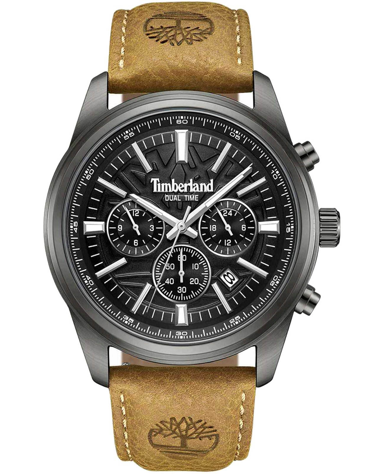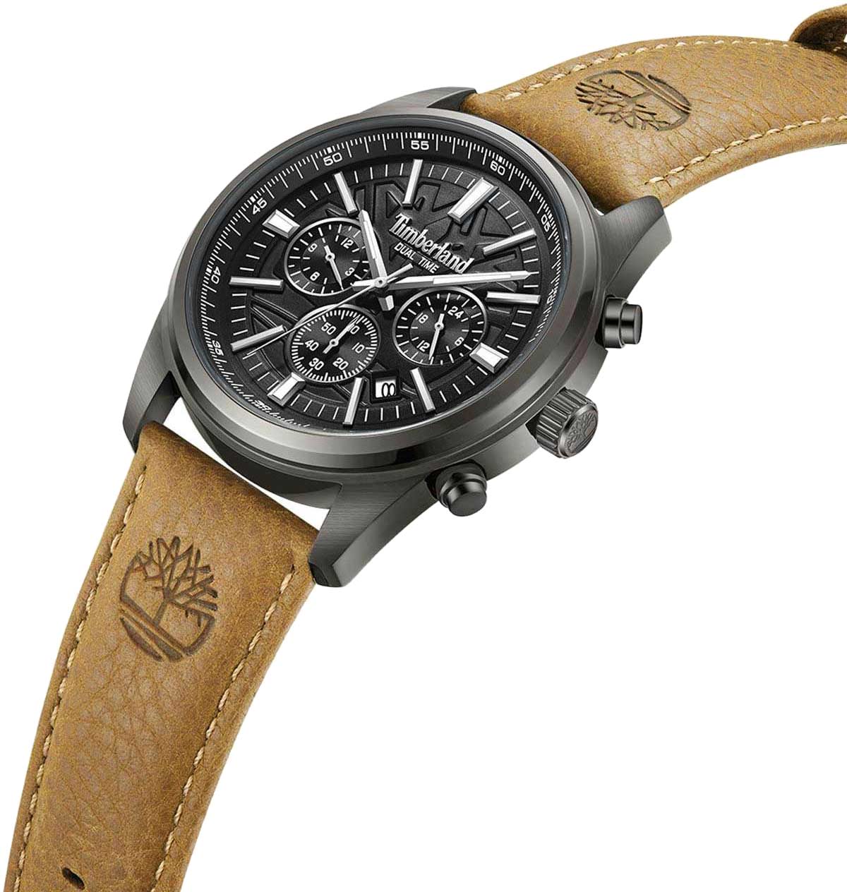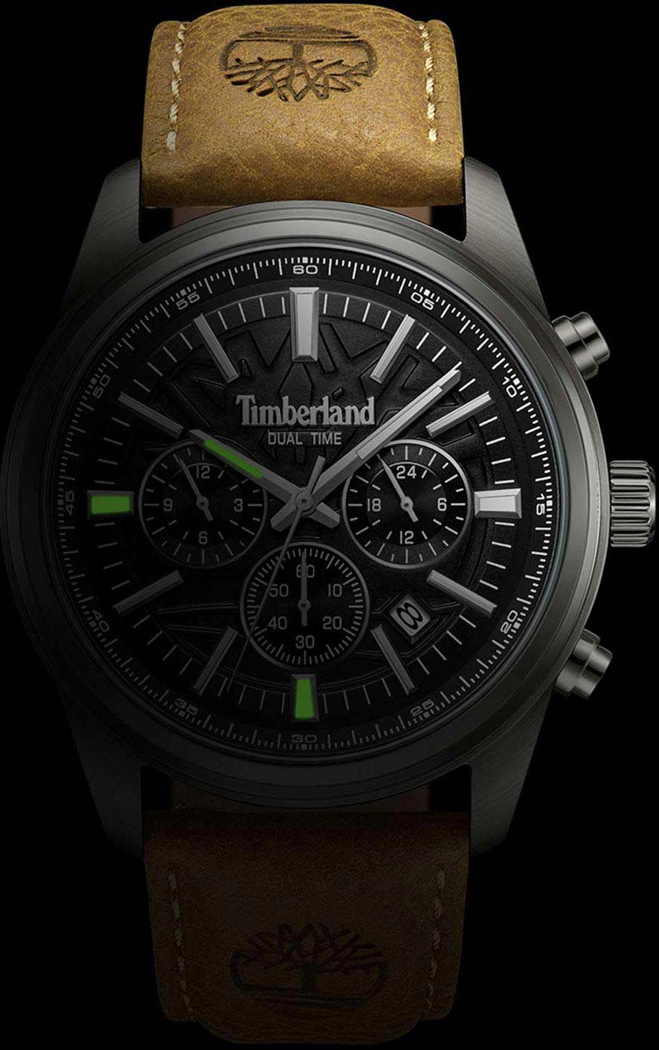 Американские мужские часы Timberland Northbridge TDWGF0041205 c хронографомХронографФункция позволяет измерять отрезки времени с особой точностью: часы, минуты, секунды. Верным признаком хронографа является наличие на циферблате 3 дополнительных окошек-счётчиков. имеют кварцевый механизм с высокой точностью. Класс водозащиты: 50 метров, позволит защитить корпус от случайных брызг или капель дождя. Корпус часов изготовлен из стали с PVD-покрытиемPVDУльтратонкое покрытие наносится в технике вакуумного напыления, сочетает в себе нитрид титана особой прочности со слоем золота или оксида хрома. Несёт в себе декоративную или защитную функцию.. Прочное минеральное стеклоМинеральное стеклоМинеральное стекло представляет собой искусственно выращенный минерал кварца. Такое стекло отличается особой устойчивостью к повреждениям и царапинам. Уступает по некоторым качествам сапфировому стеклу.. Стрелки c люминесцентным покрытиемЛюминесцентное покрытиеПозволяет считывать показания времени в темноте. Производители наносят на стрелки, часовые индексы, безель или поверхность циферблата светонакопительный состав, дающий холодное свечение.. Кожаный ремешок на стандартной застежке.