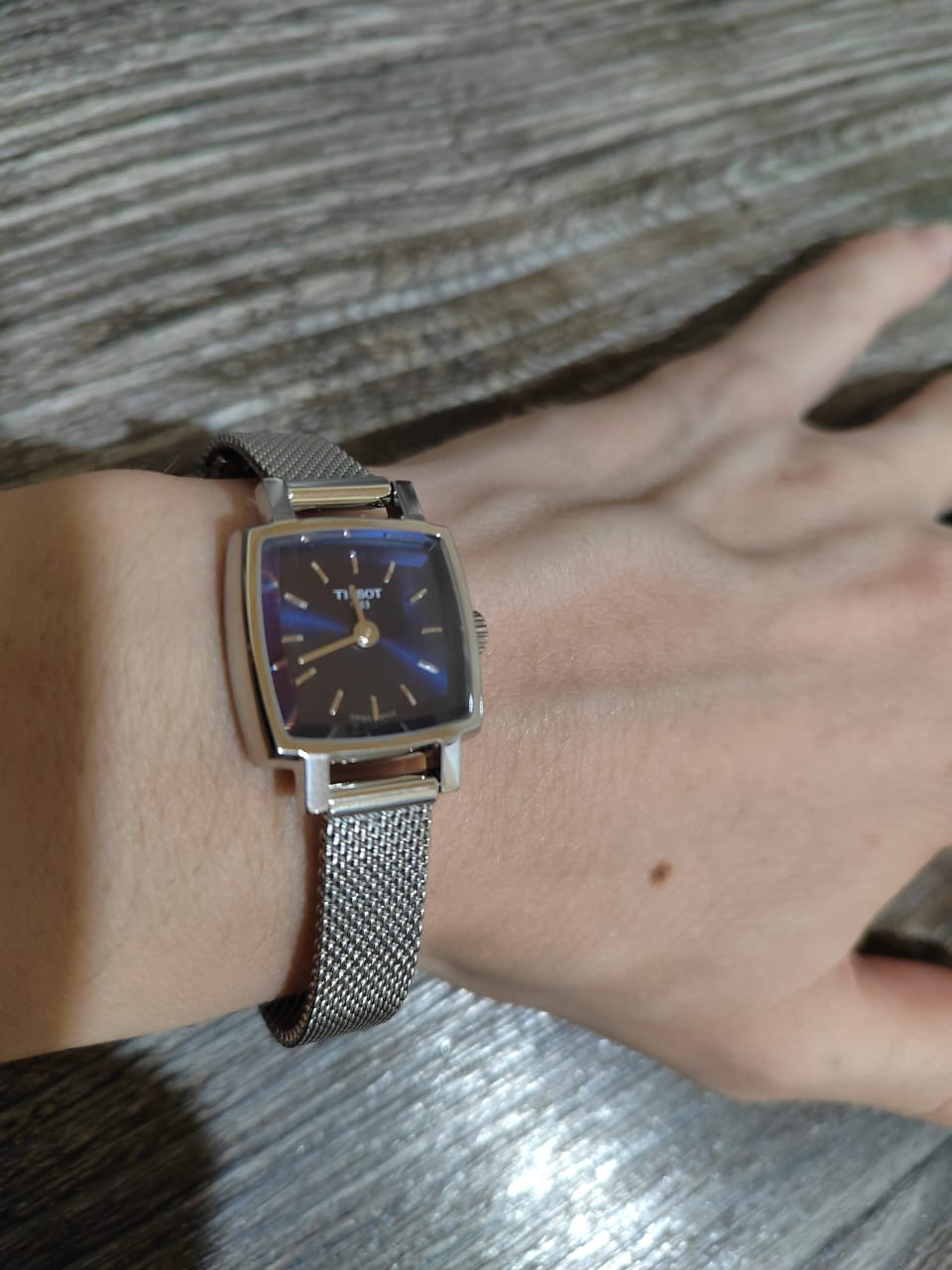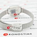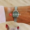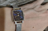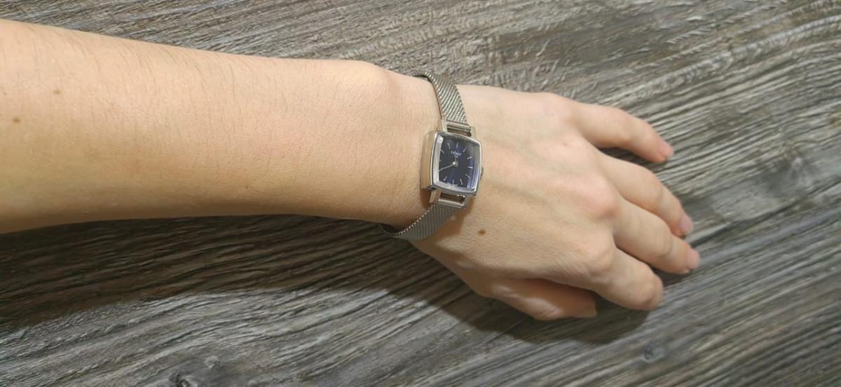 Корпус часов изготовлен из нержавеющей стали. Он очень миниатюрный 20х20 мм. На заводной головке выгравирована буква T. Механизм кварцевый. На запястье часы смотрятся женственно и изящно.