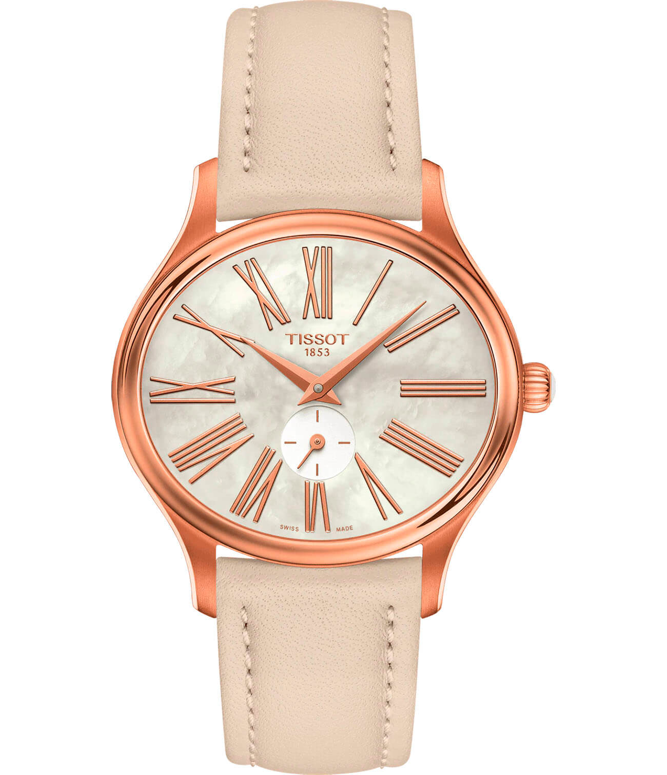 Модель отличается оригинальным внешним видом, традиционные формы выражены в современном стиле. Овальный перламутровый циферблат с римскими цифрами имеет отдельный секундный счётчик, что прибавляет толику спортивности. Наручные часы отличаются высокой точностью хода благодаря кварцевому механизму ETA 980.153. Корпус из долговечной стали 316L с цветным PVD-покрытиемPVDУльтратонкое покрытие наносится в технике вакуумного напыления, сочетает в себе нитрид титана особой прочности со слоем золота или оксида хрома. Несёт в себе декоративную или защитную функцию.. Ремешок из натуральной кожи кремового оттенка. Сапфировое стекло. Функция EOLEOLПредставляет собой систему, уведомляющую владельца часов о необходимости замены элемента питания. За 2 недели до полного разряда батарейки секундная стрелка перестаёт ходить чётко и начинает перепрыгивать на 3-4 деления.. Габариты: 28 x 31,4 x 6,6 мм.