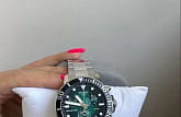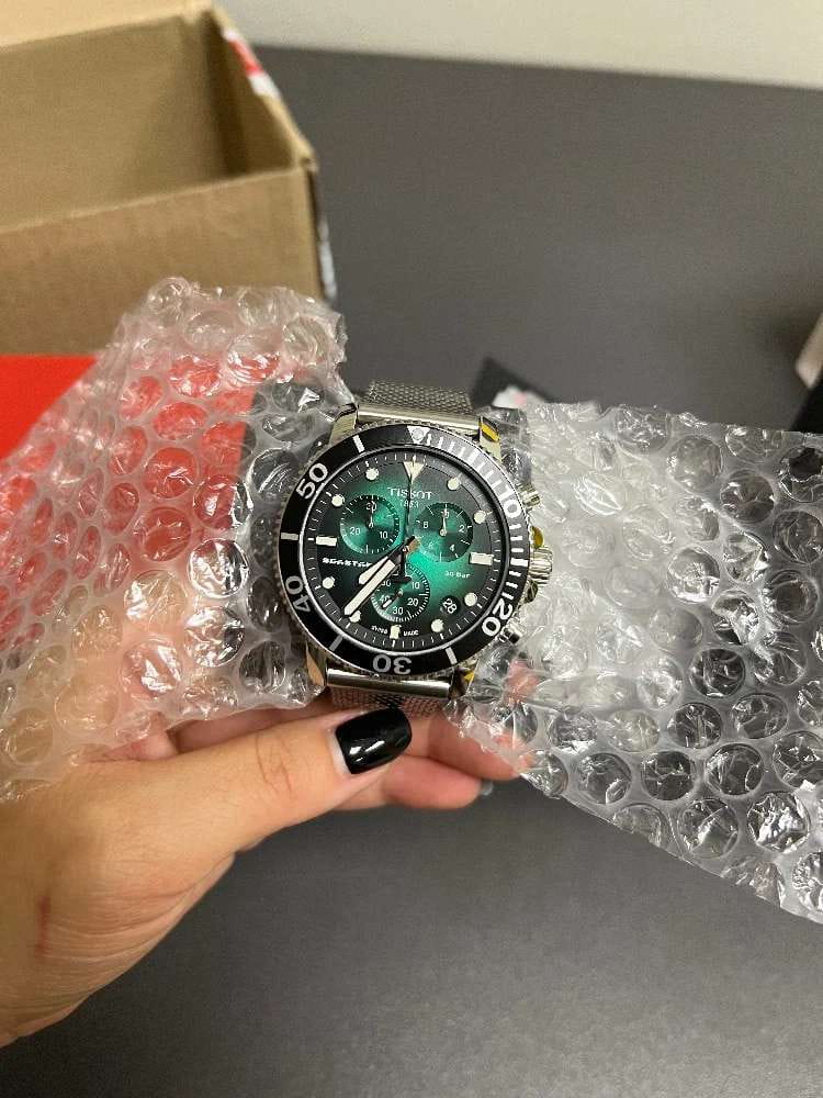На фоне серебристого браслета и темного безеляБезельВнешний ободок, закрепляющий стекло. В спортивных часах так называется поворотное кольцо с делениями на циферблате, выполняет роль таймера – замеряет отрезки времени на шкале. Неподвижный безель – элемент декора. Однонаправленно вращающийся безель на дайверских часах позволяет фиксировать моменты погружения и выныривания на поверхность. ярко выделяется зеленый циферблат, отлично видны серебристые стрелки и часовые метки с люминесцентным покрытиемЛюминесцентное покрытиеПозволяет считывать показания времени в темноте. Производители наносят на стрелки, часовые индексы, безель или поверхность циферблата светонакопительный состав, дающий холодное свечение.. Кварцевые часы оснащены батареей Renata 394. Завинчивающиеся кнопки, головка, прозрачная задняя крышка. Сапфировое стекло. Апертура даты. Габариты: 43 x 43 x 12,7 мм.