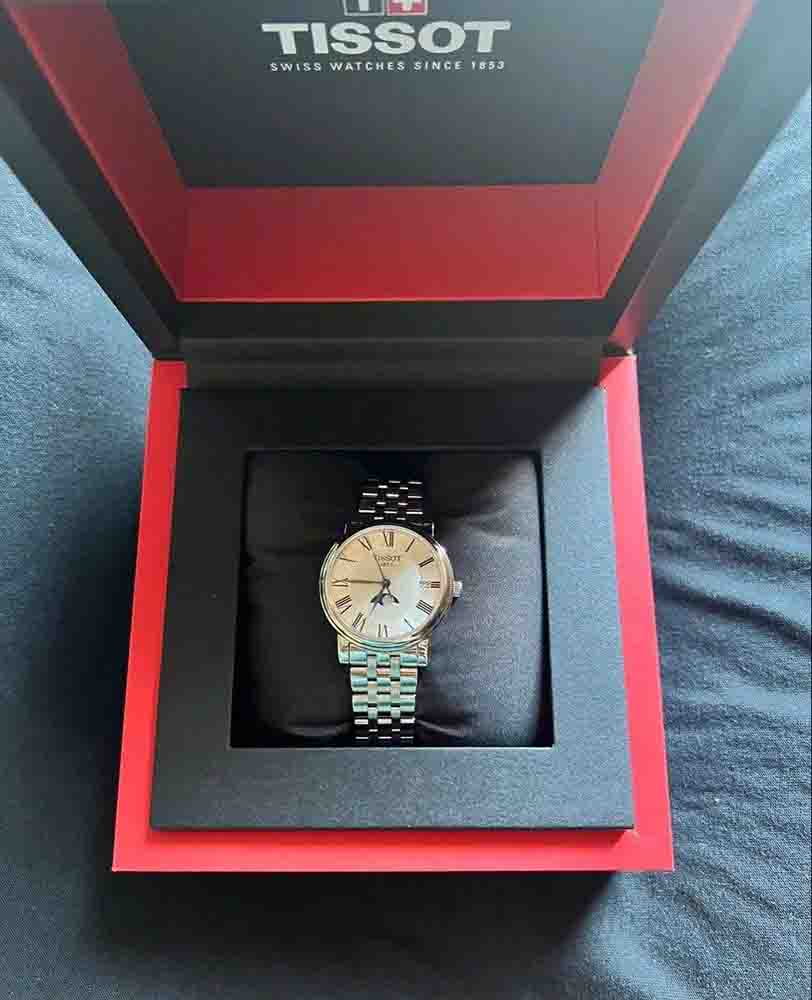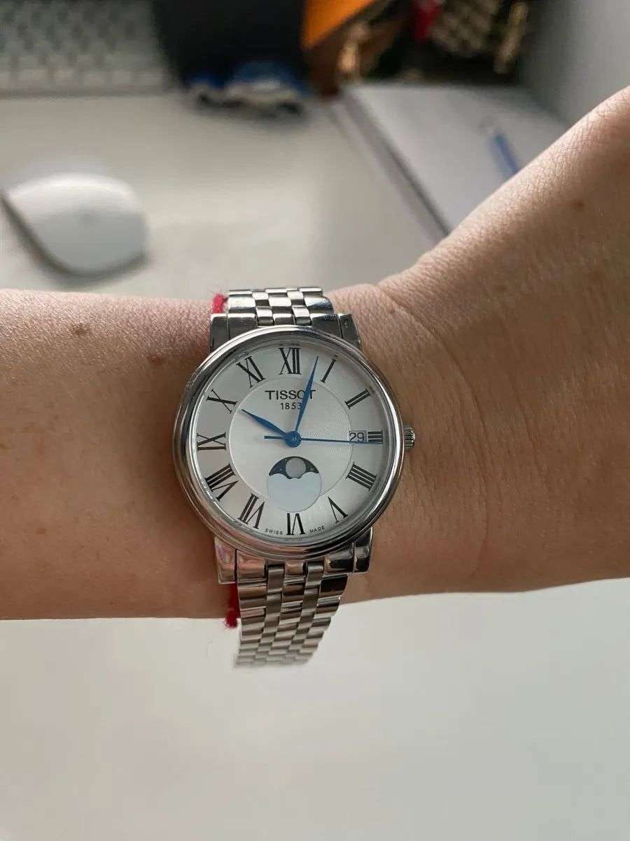 Женские швейцарские часы Tissot Carson Premium Lady Moonphase T122.223.11.033.00, кварцевый высокоточный механизм F05.841 с индикатором заряда батареи EOL.