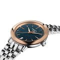 Оригинальный циферблат идеально смотрится в сочетании с элегантным безелемБезельВнешний ободок, закрепляющий стекло. В спортивных часах так называется поворотное кольцо с делениями на циферблате, выполняет роль таймера – замеряет отрезки времени на шкале. Неподвижный безель – элемент декора. Однонаправленно вращающийся безель на дайверских часах позволяет фиксировать моменты погружения и выныривания на поверхность., выполненным из 18-ти каратного розового золота18-каратное золотоОбозначение по каратной системе пробирования, оно показывает, сколько драгоценного металла содержится в изделии. 18 карат - в составе 75% чистого золота, соответствует 750 пробе.