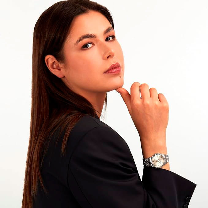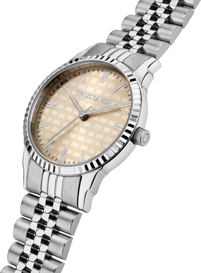 Итальянские женские часы Trussardi T-Bent R2453144512 - это стильный женский аксессуар, который сочетает элегантный дизайн и практичность. Корпус выполнен из нержавеющей стали, что обеспечивает долговечность и утончённый внешний вид. БезельБезельВнешний ободок, закрепляющий стекло. В спортивных часах так называется поворотное кольцо с делениями на циферблате, выполняет роль таймера – замеряет отрезки времени на шкале. Неподвижный безель – элемент декора. Однонаправленно вращающийся безель на дайверских часах позволяет фиксировать моменты погружения и выныривания на поверхность. с алмазной гранью. Надежное минеральное стеклоМинеральное стеклоМинеральное стекло представляет собой искусственно выращенный минерал кварца. Такое стекло отличается особой устойчивостью к повреждениям и царапинам. Уступает по некоторым качествам сапфировому стеклу. защищает циферблат от царапин и обеспечивает долговечность. Модель оснащена кварцевым механизмом, обеспечивающим высокую точность хода. Браслет из нержавеющей стали на раскладной застёжкеРаскладная застёжкаТакой тип застёжки используется только на браслетах из металла. Она никогда не раскрывается полностью, происходит разделение на 2 и более частей. Раскладывающая застёжка снизит вероятность потери часов к минимуму. обеспечивает комфортное ношение. Водозащита 50 метров позволит защитить корпус от случайных брызг или капель дождя. Эта модель – отличный выбор для тех, кто ищет сочетание стиля, качества и функциональности. Часы станут не только полезным аксессуаром, но и выразительным элементом вашего имиджа.