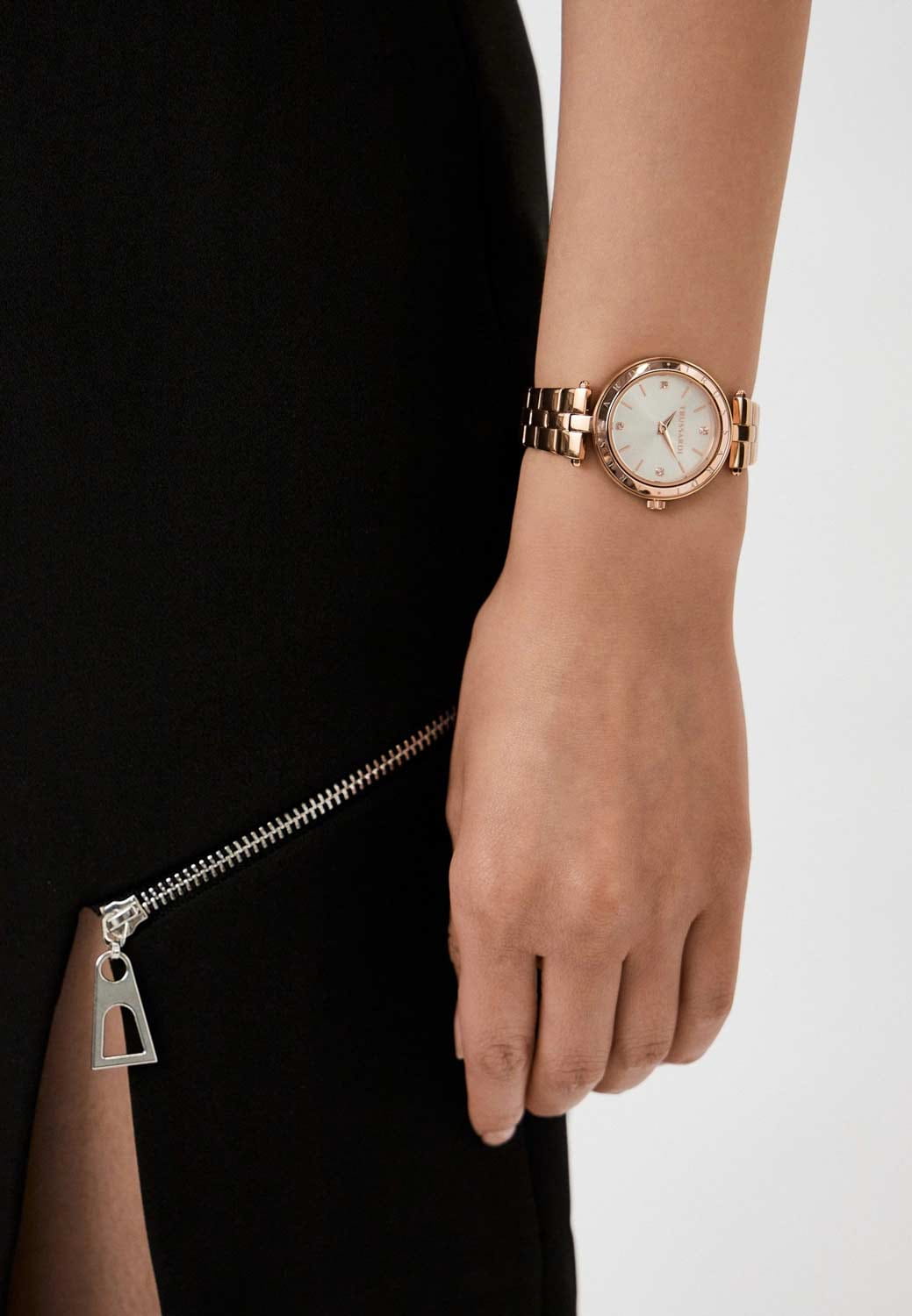 Итальянские женские часы Trussardi T-Shiny R2453145512 - это стильный женский аксессуар, который сочетает элегантный дизайн и практичность. Корпус выполнен из нержавеющей стали с IP-покрытиемIP-покрытиеМетод ионного напыления. Демонстрирует повышенную устойчивость к истиранию, окислению и химическим веществам. Под воздействием высокого давления и температуры около 1500°C молекулы металла надёжно соединяются с частицами корпуса часов., что обеспечивает долговечность и утончённый внешний вид. Надежное минеральное стеклоМинеральное стеклоМинеральное стекло представляет собой искусственно выращенный минерал кварца. Такое стекло отличается особой устойчивостью к повреждениям и царапинам. Уступает по некоторым качествам сапфировому стеклу. защищает циферблат с кристаллами от царапин и обеспечивает долговечность. Модель оснащена кварцевым механизмом, обеспечивающим высокую точность хода. Браслет из нержавеющей стали с IP-покрытиемIP-покрытиеМетод ионного напыления. Демонстрирует повышенную устойчивость к истиранию, окислению и химическим веществам. Под воздействием высокого давления и температуры около 1500°C молекулы металла надёжно соединяются с частицами корпуса часов. на раскладной застёжкеРаскладная застёжкаТакой тип застёжки используется только на браслетах из металла. Она никогда не раскрывается полностью, происходит разделение на 2 и более частей. Раскладывающая застёжка снизит вероятность потери часов к минимуму. обеспечивает комфортное ношение. Водозащита 50 метров позволит защитить корпус от случайных брызг или капель дождя. Эта модель – отличный выбор для тех, кто ищет сочетание стиля, качества и функциональности. Часы станут не только полезным аксессуаром, но и выразительным элементом вашего имиджа.