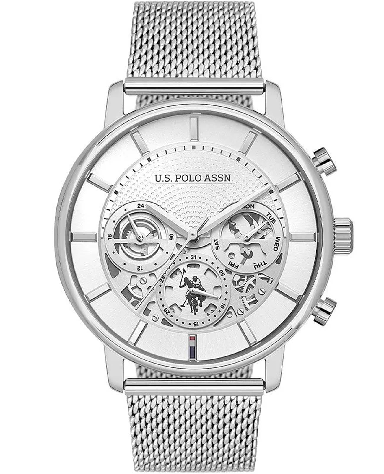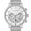 Мужские элегантные американские часы U.S. Polo Assn. Crossing USPA1102-01 со скелетонизированным циферблатом обладают кварцевым механизмом с высокой точностью. Минеральное стеклоМинеральное стеклоМинеральное стекло представляет собой искусственно выращенный минерал кварца. Такое стекло отличается особой устойчивостью к повреждениям и царапинам. Уступает по некоторым качествам сапфировому стеклу. устойчивое к появлению царапин, обладающее высокой прозрачностью. Изысканный корпус изготовлен из нержавеющей стали. Стильные лаконичные центральные часовая, минутная и секундная стрелки. Индикация даты и дня недели, а также 24х часовой формат времени вынесены на отдельный циферблат. Класс водозащиты: 50 метров, позволит защитить корпус от случайных брызг или капель дождя. Браслет из стали выполнен в технике миланского плетения, оснащён раскладным замкомРаскладной замокДанный вариант застежки используется только на часах с металлическим браслетом. Отличительная особенность такого крепления в том, что длина браслета становится универсальной и вы можете самостоятельно отрегулировать нужный вам размер – застежка просто двигается по браслету часов., добавляя завершающий штрих к этому стильному и высокоэффективному аксессуару. Это практичный и стильный инструмент для активной повседневности, объединяющий точный механизм и удобство.