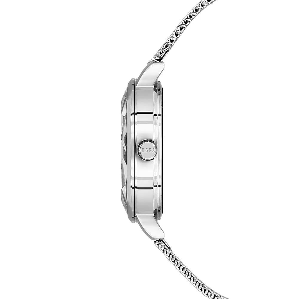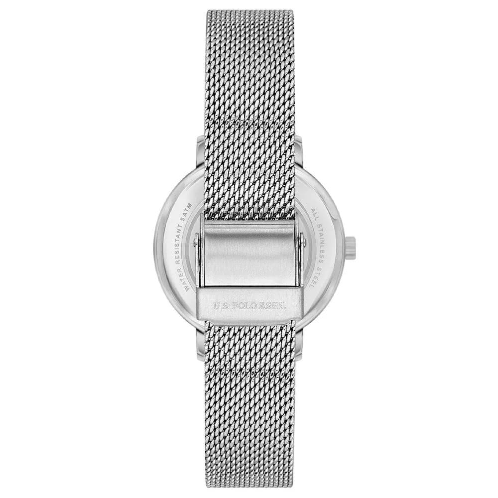 Женские часы U.S. Polo Assn. Stile USPA2079-06, кварцевый механизм с высокой точностью. Минеральное стеклоМинеральное стеклоМинеральное стекло представляет собой искусственно выращенный минерал кварца. Такое стекло отличается особой устойчивостью к повреждениям и царапинам. Уступает по некоторым качествам сапфировому стеклу. устойчивое к появлению царапин, обладающее высокой прозрачностью. Изысканный корпус изготовлен из нержавеющей стали. Лаконичные центральные часовая, минутная и секундная стрелки. Водонепроницаемость 5 АТМ позволяет использовать часы в повседневных условиях — при мытье рук или под лёгким дождём. Браслет выполнен в технике миланского плетения из стали и оснащён раскладным замкомРаскладная застёжкаТакой тип застёжки используется только на браслетах из металла. Она никогда не раскрывается полностью, происходит разделение на 2 и более частей. Раскладывающая застёжка снизит вероятность потери часов к минимуму., обеспечивающий комфорт и уверенную фиксацию на запястье, а также добавляя завершающий штрих к этому стильному аксессуару. Циферблат с кристаллами подчёркивает изысканный характер часов, создавая универсальный образ, подходящий как для повседневных ситуаций, так и для особых случаев.