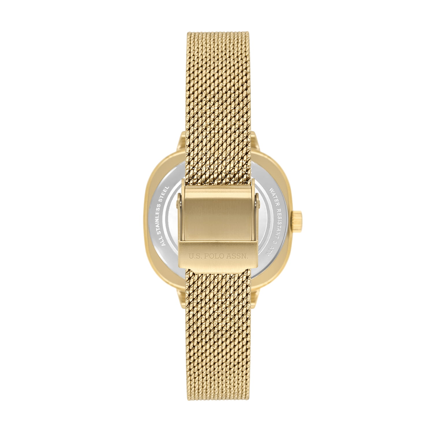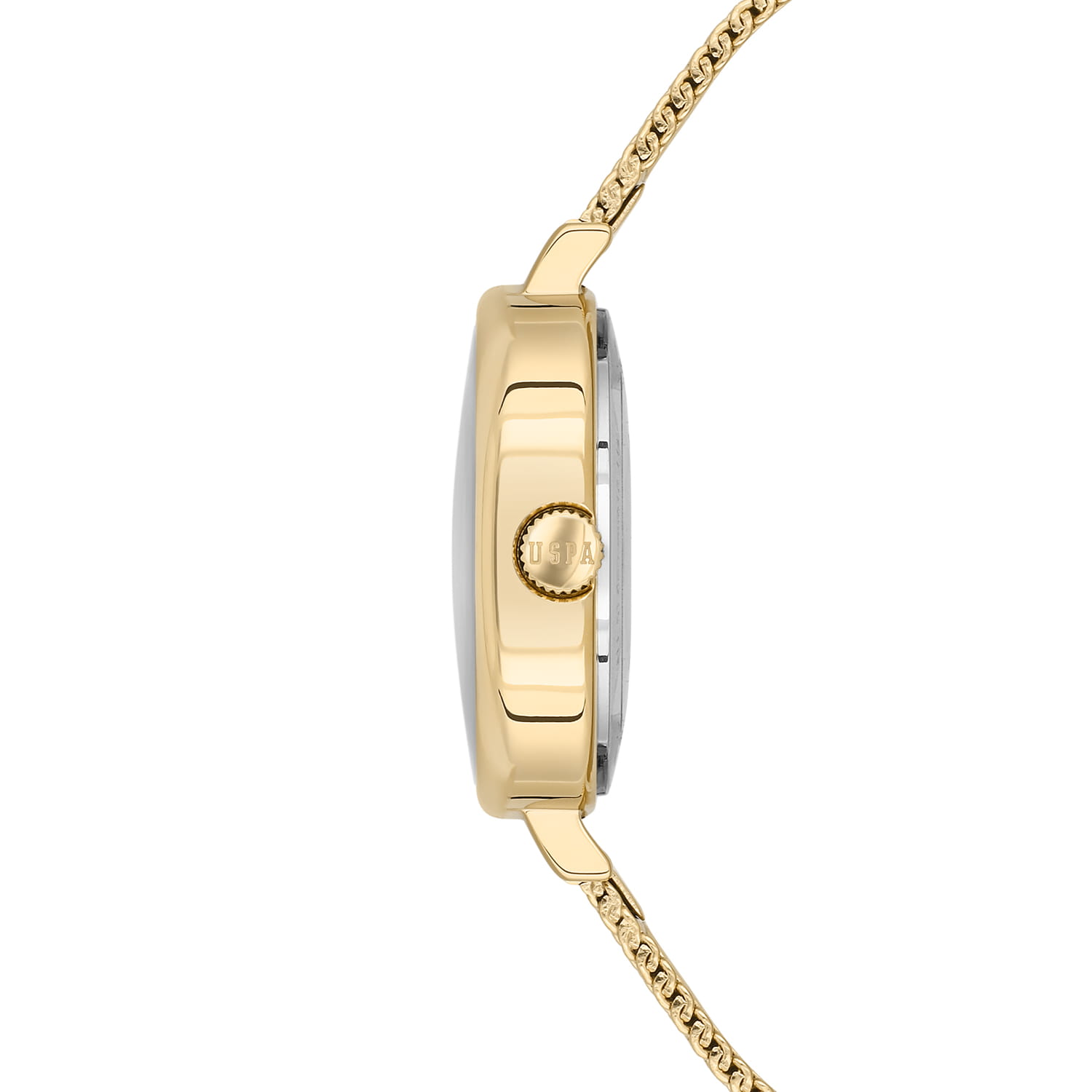 Женские часы U.S. Polo Assn. USPA2087-02 кварцевый механизм с высокой точностью. Минеральное стеклоМинеральное стеклоМинеральное стекло представляет собой искусственно выращенный минерал кварца. Такое стекло отличается особой устойчивостью к повреждениям и царапинам. Уступает по некоторым качествам сапфировому стеклу. устойчивое к появлению царапин, обладающее высокой прозрачностью. Корпус изготовлен из нержавеющей стали . Класс водозащиты: 30 метров, позволит защитить корпус от случайных брызг или капель дождя. Стальной браслет миланского плетения с IP-покрытиемIP-покрытиеМетод ионного напыления. Демонстрирует повышенную устойчивость к истиранию, окислению и химическим веществам. Под воздействием высокого давления и температуры около 1500°C молекулы металла надёжно соединяются с частицами корпуса часов. на раскладной застёжкеРаскладная застёжкаТакой тип застёжки используется только на браслетах из металла. Она никогда не раскрывается полностью, происходит разделение на 2 и более частей. Раскладывающая застёжка снизит вероятность потери часов к минимуму.. Неподвижный безельБезельВнешний ободок, закрепляющий стекло. В спортивных часах так называется поворотное кольцо с делениями на циферблате, выполняет роль таймера – замеряет отрезки времени на шкале. Неподвижный безель – элемент декора. Однонаправленно вращающийся безель на дайверских часах позволяет фиксировать моменты погружения и выныривания на поверхность. с IP-покрытиемIP-покрытиеМетод ионного напыления. Демонстрирует повышенную устойчивость к истиранию, окислению и химическим веществам. Под воздействием высокого давления и температуры около 1500°C молекулы металла надёжно соединяются с частицами корпуса часов.