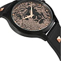 На запястье эти массивные дизайнерские часы смотрятся эффектно, стильно и завораживающе. Они надолго приковывают внимание окружающих. Дизайнерские часы Domus с круглым черным корпусом. Циферблат украшен изящным изображением головы льва. Рифленая заводная головка. Кожаный ремешок декорирован металлическими заклепками.