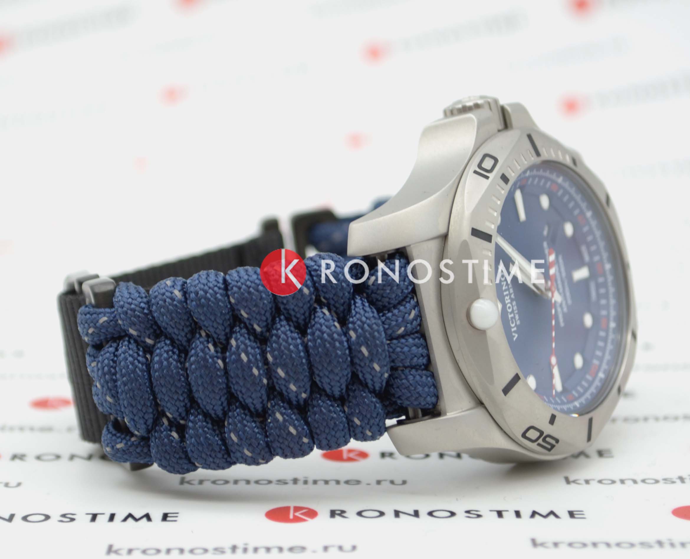 Мужские швейцарские часы Victorinox I.N.O.X. Professional Diver 241843. Сапфировое стеклоСапфировое стеклоПрочный и надёжный материал из кристалла сапфира синтетического происхождения, характеризующийся особой твёрдостью и устойчивостью к царапинам и повреждениям. с трёхслойным антибликовым покрытием. Корпус часов выполнен из карбона. Ремешок изготовлен из плетенной паракордовой стропы, длиной 2,5 метра и способной выдержать 250 кг. Влагозащита: 200 метров, позволит плавать, нырять и заниматься другими водными видами спорта. Окошко даты находится в положении между 4 и 5 часов. Стрелки и метки с люминесцентным покрытиемЛюминесцентное покрытиеПозволяет считывать показания времени в темноте. Производители наносят на стрелки, часовые индексы, безель или поверхность циферблата светонакопительный состав, дающий холодное свечение.. В комплекте съемный защитный бампер с увеличительным стеклом и резиновый ремешок.