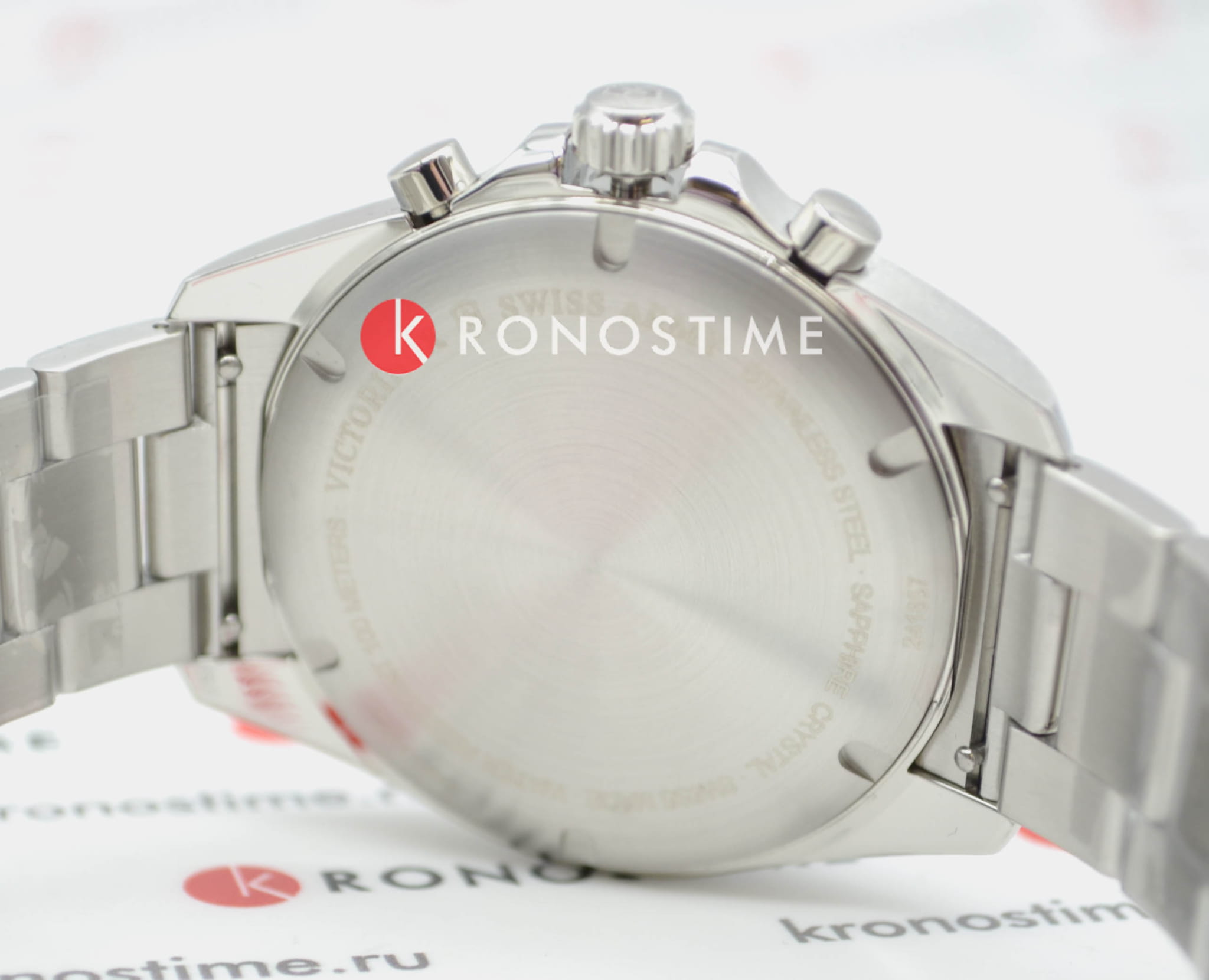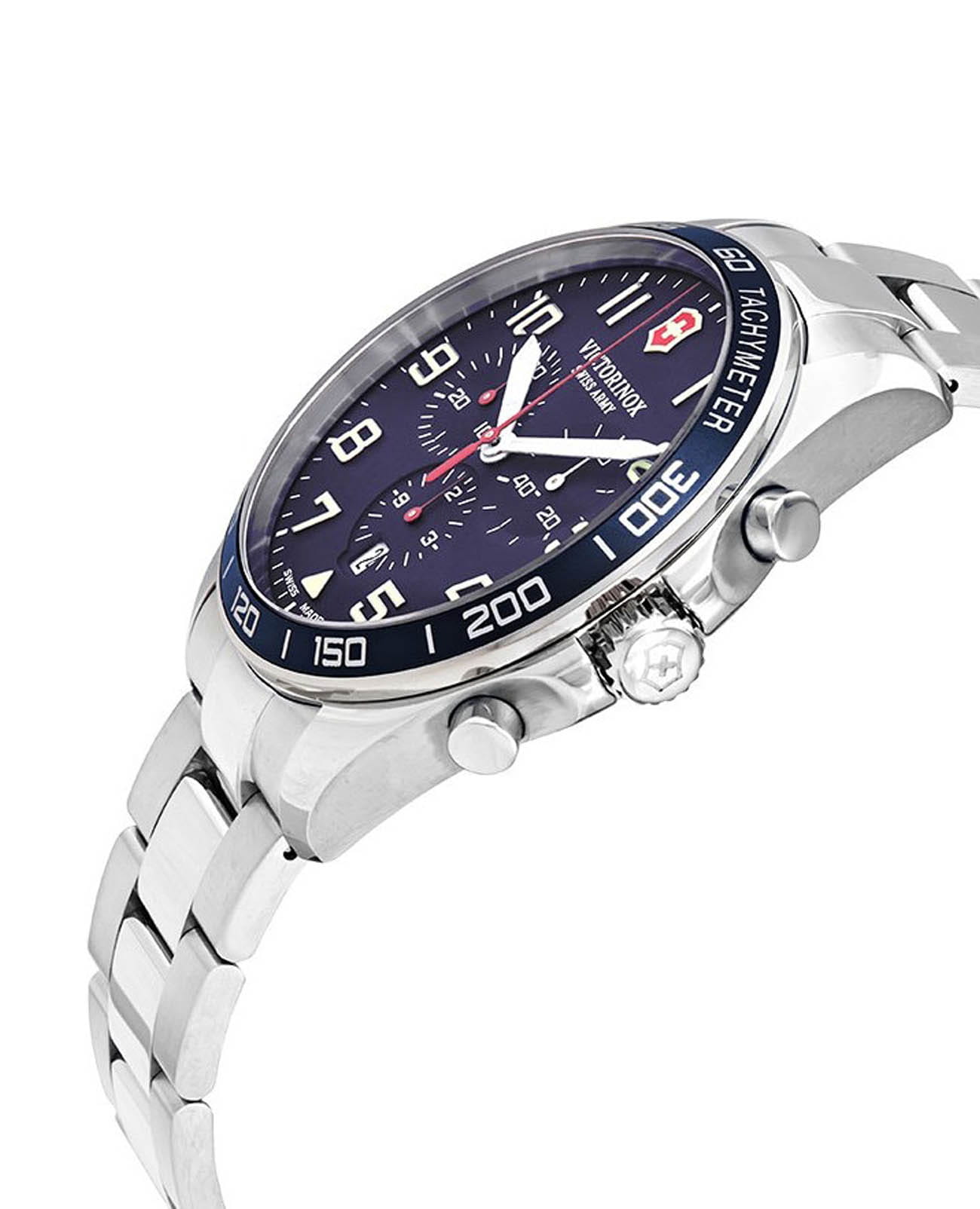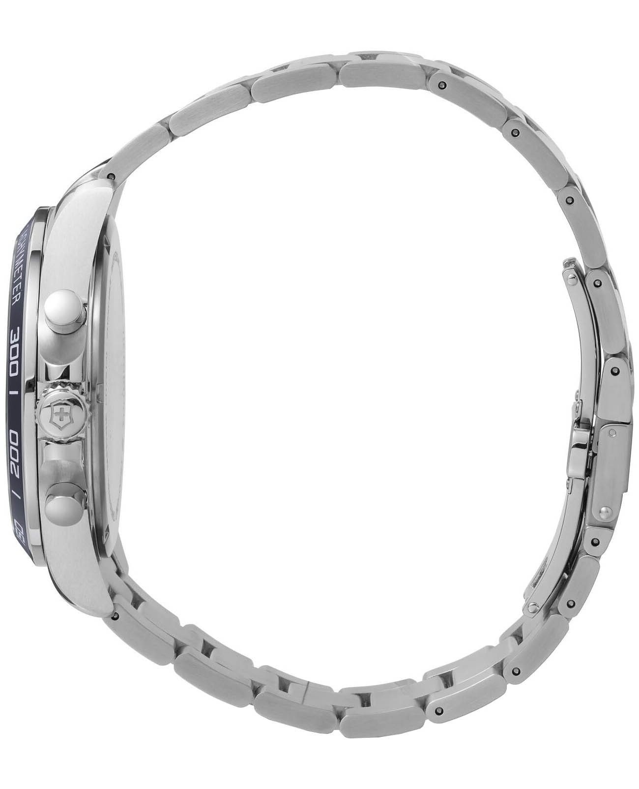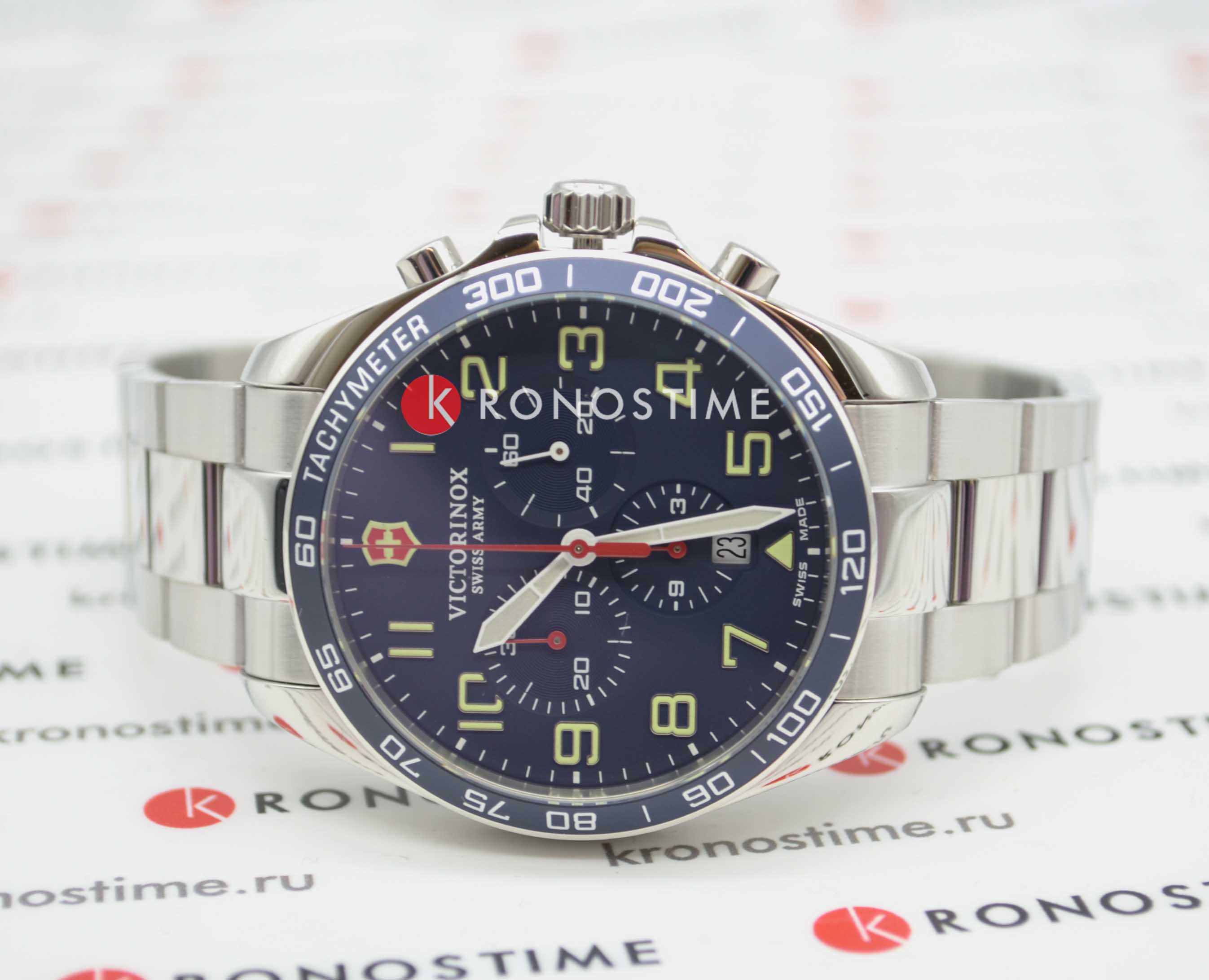 Мужские швейцарские часы-хронографХронографФункция позволяет измерять отрезки времени с особой точностью: часы, минуты, секунды. Верным признаком хронографа является наличие на циферблате 3 дополнительных окошек-счётчиков. Victorinox Fieldforce Chronograph 241857 с надёжным кварцевым механизмом. Сапфировое стеклоСапфировое стеклоПрочный и надёжный материал из кристалла сапфира синтетического происхождения, характеризующийся особой твёрдостью и устойчивостью к царапинам и повреждениям. с трёхслойным антибликовым покрытием. Корпус часов выполнен из нержавеющей стали 316L. Стальной браслет на раскладной застёжкеРаскладная застёжкаТакой тип застёжки используется только на браслетах из металла. Она никогда не раскрывается полностью, происходит разделение на 2 и более частей. Раскладывающая застёжка снизит вероятность потери часов к минимуму.. Влагозащита: 100 метров, позволит плавать, нырять и заниматься другими водными видами спорта. Окошко даты находится в положении 6 часов, стрелки и метки с люминесцентным покрытиемЛюминесцентное покрытиеПозволяет считывать показания времени в темноте. Производители наносят на стрелки, часовые индексы, безель или поверхность циферблата светонакопительный состав, дающий холодное свечение., тахиметрТахиметрРазмеченная шкала, располагается на ободке или безеле часов. Тахиметр позволяет рассчитать скорость на определённом участке пути, расстояние измеряется в километрах или милях..