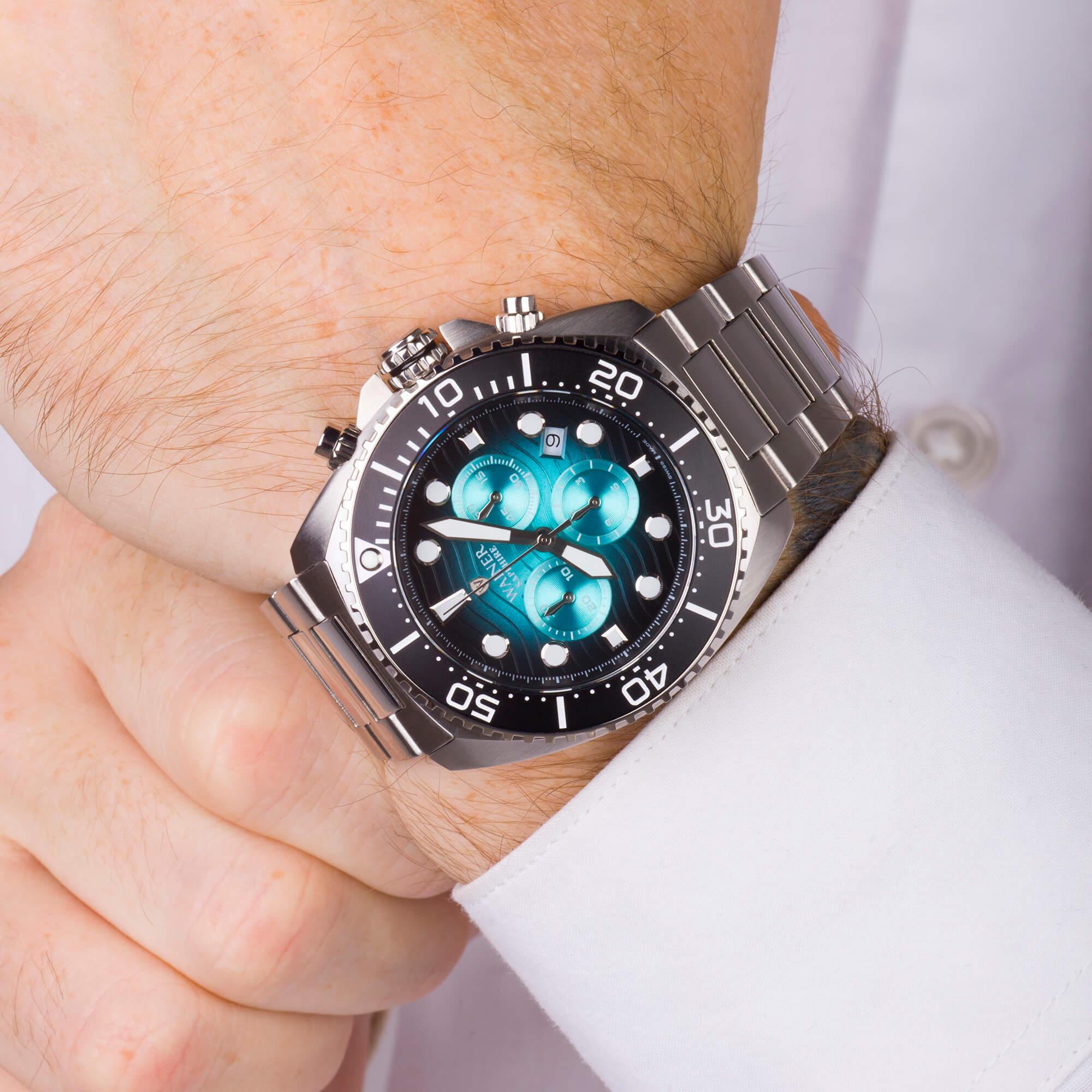 Швейцарские мужские кварцевые часы-хронограф Wainer WA.10300-A с механизмом хронографа и секундомером станут идеальным выбором для уверенных мужчин, ценящих каждую секунду времени. Круглый корпус из нержавеющей стали 316L с частичным PVD-покрытиемPVDУльтратонкое покрытие наносится в технике вакуумного напыления, сочетает в себе нитрид титана особой прочности со слоем золота или оксида хрома. Несёт в себе декоративную или защитную функцию. защищен прочным сапфировым стекломСапфировое стеклоПрочный и надёжный материал из кристалла сапфира синтетического происхождения, характеризующийся особой твёрдостью и устойчивостью к царапинам и повреждениям.. Циферблат украшен декоративным узором в виде волнистых линий и фирменным логотипом Wainer, метками в виде точек и оснащен окошком даты. Стрелки и метки с люминесцентным покрытиемЛюминесцентное покрытиеПозволяет считывать показания времени в темноте. Производители наносят на стрелки, часовые индексы, безель или поверхность циферблата светонакопительный состав, дающий холодное свечение. обеспечивают хорошую видимость в темное время суток. Поворотный безельБезельВнешний ободок, закрепляющий стекло. В спортивных часах так называется поворотное кольцо с делениями на циферблате, выполняет роль таймера – замеряет отрезки времени на шкале. Неподвижный безель – элемент декора. Однонаправленно вращающийся безель на дайверских часах позволяет фиксировать моменты погружения и выныривания на поверхность. и рифленая заводная головка с защитой добавляют практичности модели. Часы имеют класс водозащиты 200 метров, позволит плавать, нырять и заниматься другими водными видами спорта. Модель комплектуется стальным браслетом из нержавеющей стали 316L. Функциональный дизайн и надежное качество швейцарского производства делают эти часы превосходным выбором для современного мужчины.