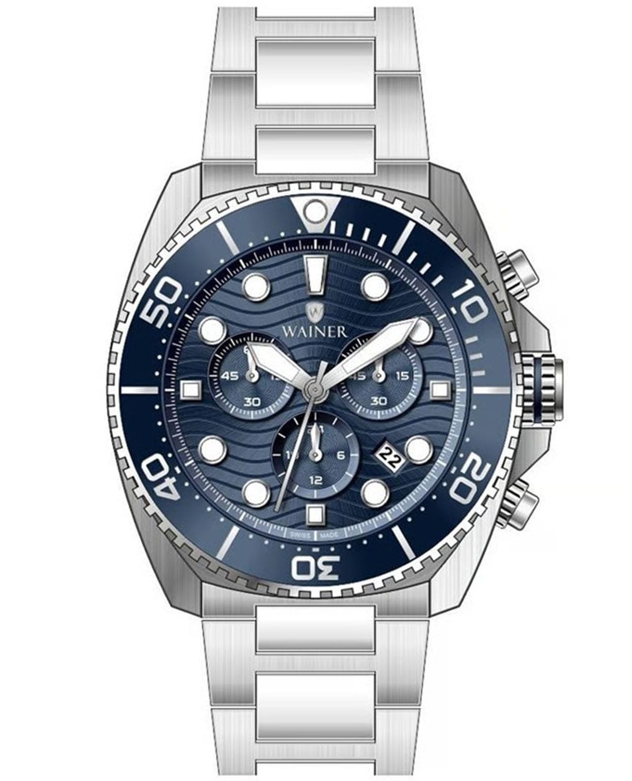 Швейцарские наручные часы Wainer WA.10300-B с хронографомХронографФункция позволяет измерять отрезки времени с особой точностью: часы, минуты, секунды. Верным признаком хронографа является наличие на циферблате 3 дополнительных окошек-счётчиков.. Кварцевый механизм с высокой точностью. Сапфировое стеклоСапфировое стеклоПрочный и надёжный материал из кристалла сапфира синтетического происхождения, характеризующийся особой твёрдостью и устойчивостью к царапинам и повреждениям. устойчивое к появлению царапин, обладающее высокой прозрачностью. Стрелки с люминесцентным покрытиемЛюминесцентное покрытиеПозволяет считывать показания времени в темноте. Производители наносят на стрелки, часовые индексы, безель или поверхность циферблата светонакопительный состав, дающий холодное свечение.. Класс водозащиты: 50 метров, позволит защитить корпус от случайных брызг или капель дождя. Корпус часов изготовлен из нержавеющей стали. Браслет с раскладной застёжкойРаскладная застёжкаТакой тип застёжки используется только на браслетах из металла. Она никогда не раскрывается полностью, происходит разделение на 2 и более частей. Раскладывающая застёжка снизит вероятность потери часов к минимуму..БезельБезельВнешний ободок, закрепляющий стекло. В спортивных часах так называется поворотное кольцо с делениями на циферблате, выполняет роль таймера – замеряет отрезки времени на шкале. Неподвижный безель – элемент декора. Однонаправленно вращающийся безель на дайверских часах позволяет фиксировать моменты погружения и выныривания на поверхность. с IP-покрытиемIP-покрытиеМетод ионного напыления. Демонстрирует повышенную устойчивость к истиранию, окислению и химическим веществам. Под воздействием высокого давления и температуры около 1500°C молекулы металла надёжно соединяются с частицами корпуса часов..