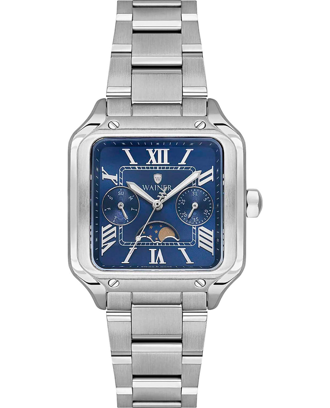 Женские кварцевые часы Wainer WA.18091-C — это стильный аксессуар, сочетающий в себе швейцарское качество и изысканный дизайн. Модель выполнена в квадратной форме из стали 316L с декоративными винтами, что придаёт ей прочность и устойчивость к царапинам. Циферблат дополнен штриховыми метками и римскими цифрами, а секундная стрелка на конце декорирована буквой W, подчёркивая внимание к деталям. Число, день недели и индикатор фазы Луны вынесены на отдельные циферблаты, что делает модель функциональной и выразительной. Защиту механизма обеспечивает сапфировое стеклоСапфировое стеклоПрочный и надёжный материал из кристалла сапфира синтетического происхождения, характеризующийся особой твёрдостью и устойчивостью к царапинам и повреждениям., устойчивое к повреждениям. Гранёная заводная головка с защитой оснащена фирменным логотипом, добавляя модели индивидуальности. Браслет из стали 316L шириной 16 мм оснащён Раскладная застёжкаРаскладная застёжкаТакой тип застёжки используется только на браслетах из металла. Она никогда не раскрывается полностью, происходит разделение на 2 и более частей. Раскладывающая застёжка снизит вероятность потери часов к минимуму., обеспечивающей комфорт и надёжную фиксацию на запястье. Водонепроницаемость позволяет использовать модель при мытье рук или под лёгким дождём. Стрелки с люминесцентным покрытиемЛюминесцентное покрытиеПозволяет считывать показания времени в темноте. Производители наносят на стрелки, часовые индексы, безель или поверхность циферблата светонакопительный состав, дающий холодное свечение. обеспечивают отличную читаемость даже в условиях слабого освещения. Механизм калибра Ronda 706.1 гарантирует точность хода и надёжность. Эти часы станут универсальным аксессуаром для тех, кто ценит сочетание стиля, функциональности и швейцарского мастерства — идеальный выбор для повседневной носки и торжественных случаев.