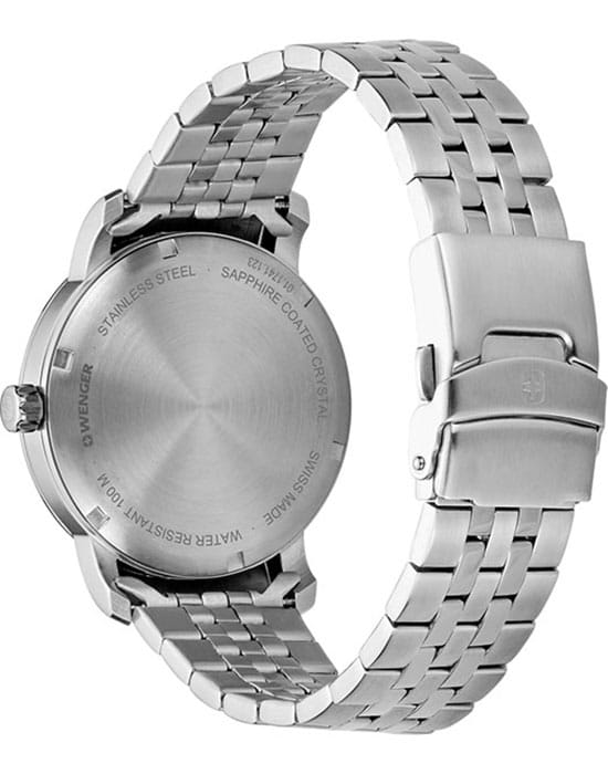 Швейцарские мужские часы в классическом стиле Wenger 01.1741.123, кварцевый механизм с высокой точностью. Класс водозащиты: 100 метров, позволит плавать, нырять и заниматься другими водными видами спорта. Корпус часов изготовлен из стали, серебристого цвета.