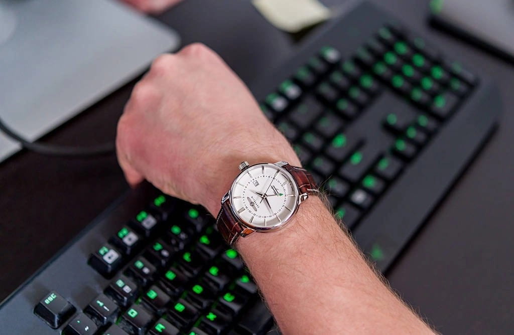 Часы Zeppelin 8442-5 — это изделие, которое идеально сидит на мужском запястье. Яркий циферблат, защищенный минеральным стекломМинеральное стеклоМинеральное стекло представляет собой искусственно выращенный минерал кварца. Такое стекло отличается особой устойчивостью к повреждениям и царапинам. Уступает по некоторым качествам сапфировому стеклу., полностью покрыт люминесцентным покрытиемЛюминесцентное покрытиеПозволяет считывать показания времени в темноте. Производители наносят на стрелки, часовые индексы, безель или поверхность циферблата светонакопительный состав, дающий холодное свечение., которое светится в темноте. Корпус часов выполнен из нержавеющей стали, а коричневый ремешок - из кожи. Дополнительной функцией часов является отображение дня месяца в положении "3 часа" и указателя GMTGMTОтображение времени второго часового пояса.Такая функция особенно актуальна для путешественников и бизнесменов,которые общаются с людьми из разных стран,теперь вы всегда будете знать,какой час у вашего партнёра или близкого человека., который позволяет устанавливать и считывать показания второго часового пояса. Водонепроницаемость часов составляет 50 метров, что означает, что вы можете спокойно принимать душ, надев Zeppelin на запястье. Эти часы подойдут для повседневного ношения и станут ярким акцентом в вашем наряде.